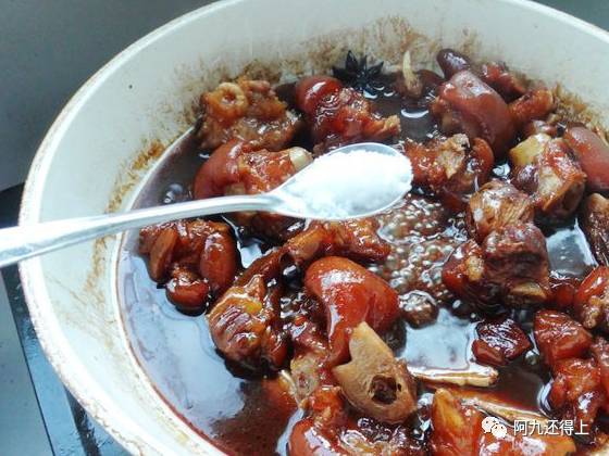 待猪蹄煮软糯后,放入适量的盐调味,然后开大火收汁,让汤汁红亮黏稠后就可以关火,起锅前放入少许的味精,味道更鲜美。
