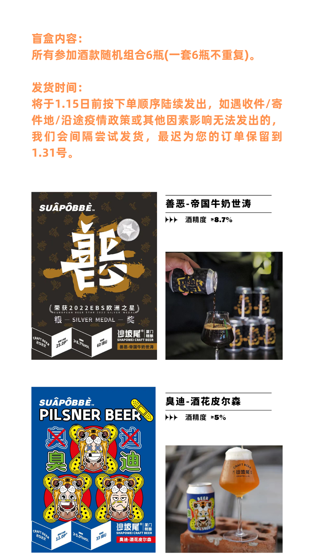 *我们将私信联系幸运粉丝,新春开工酒礼包邮费自理。中奖名单将于1月20日在微信公众号啤酒事务局及沙坡尾酿造公布,可回复“沙坡尾许愿”查询。