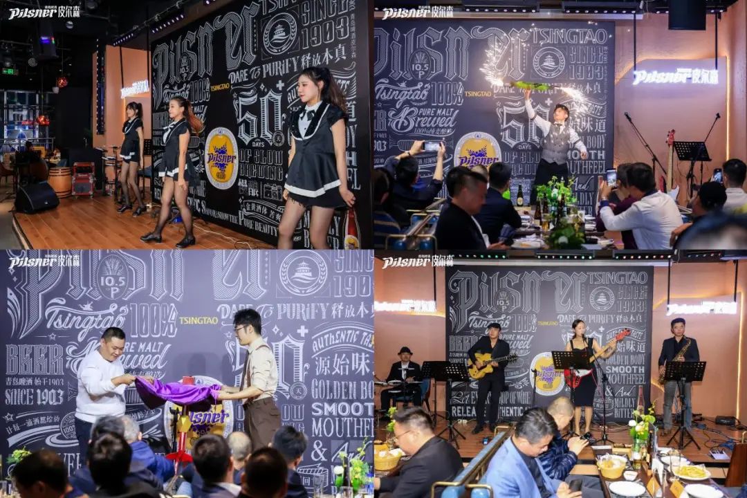 活动现场除了可以品尝到由100%纯麦酿造、传承拉格源始之味的皮尔森外,还准备了丰富多样的活动。活力四射的踢踏舞开场,以轻快、活泼、节奏感十足的舞蹈,将派对的主题“释放本真”“纯粹”“尽兴”展现得淋漓尽致;精彩绝伦的魔术表演直接来了个“闪变皮尔森”,引起全场欢呼;新奇夺目的皮尔森特调,将干辣椒、蜂蜜、柠檬汁、伏特加等配料与皮尔森融合,创作出让在场来宾连连叫绝的“热辣炸弹”;沪上知名爵士乐队通过激情澎湃地演奏一次又一次将现场气氛推至高潮;表演期间,青岛啤酒为大家准备了美食大餐,同时由主持人现场传授,介绍青岛啤酒皮尔森如何佐餐。