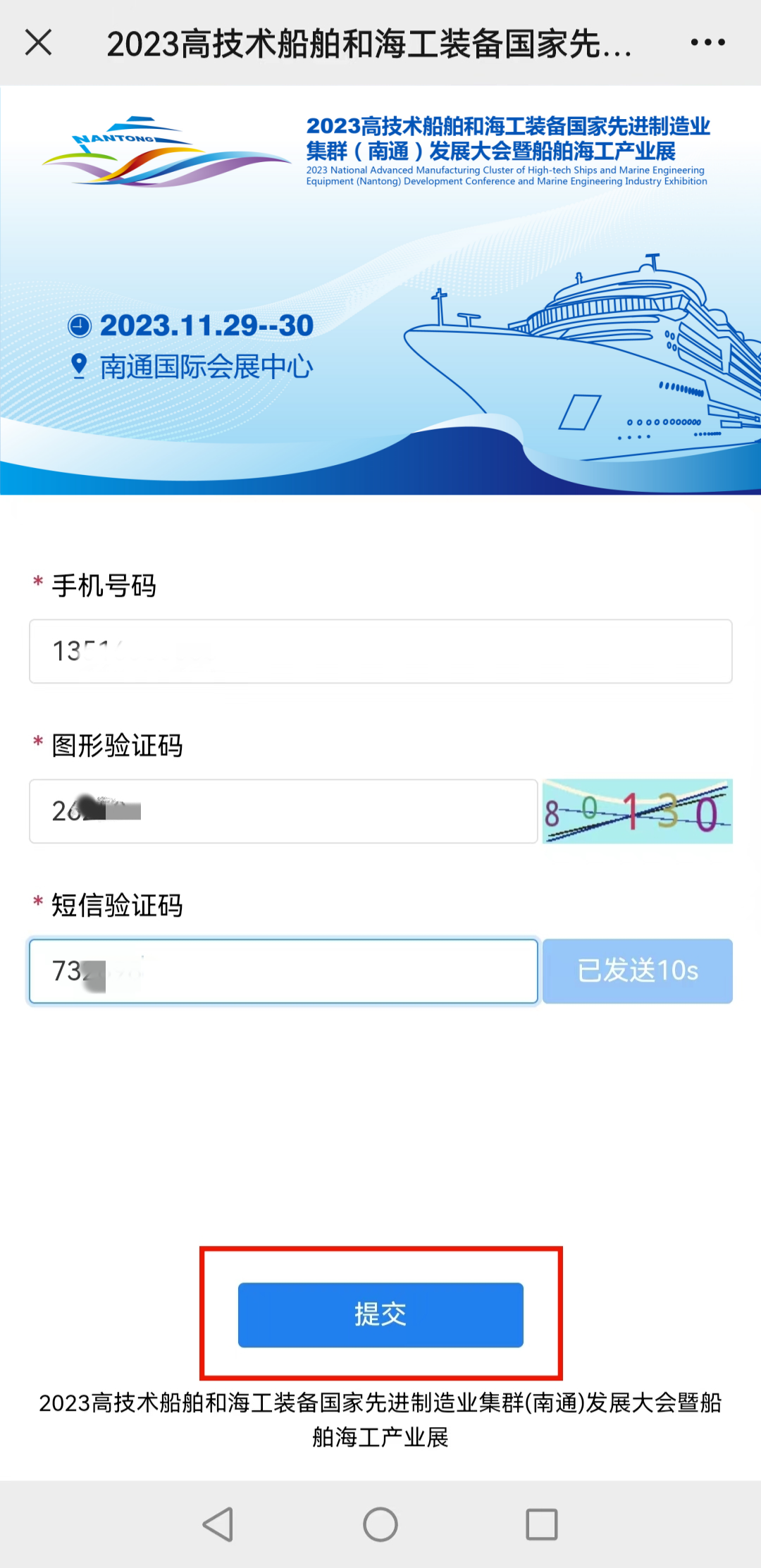 1、进入注册页面,按提示输入手机号码,收到短信验证码后点击“提交”。