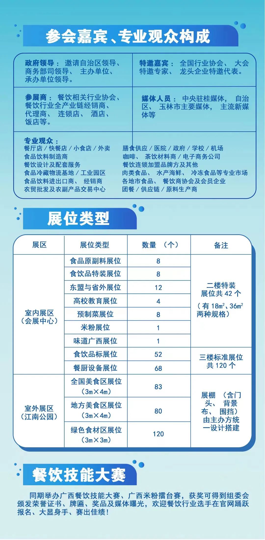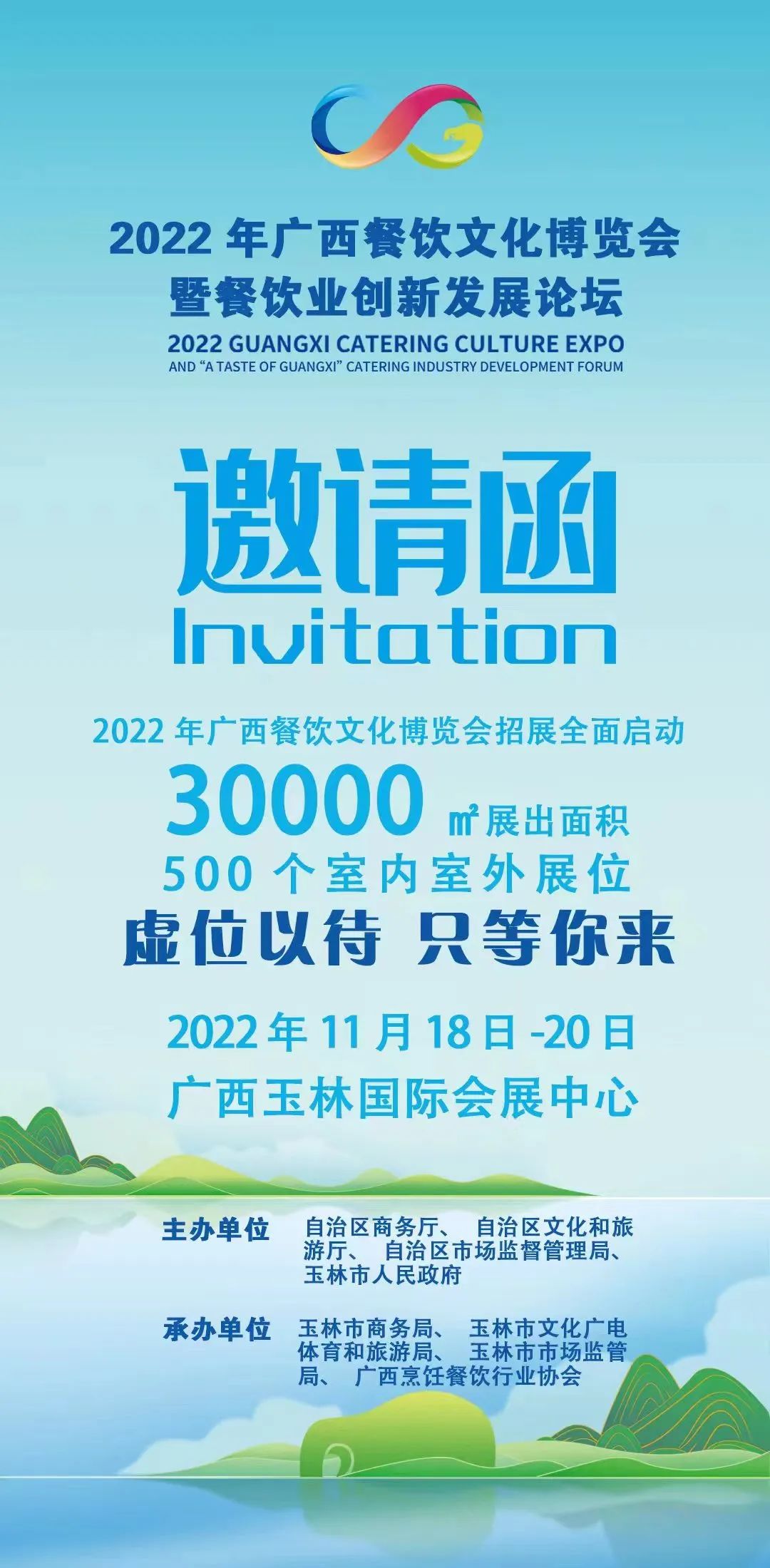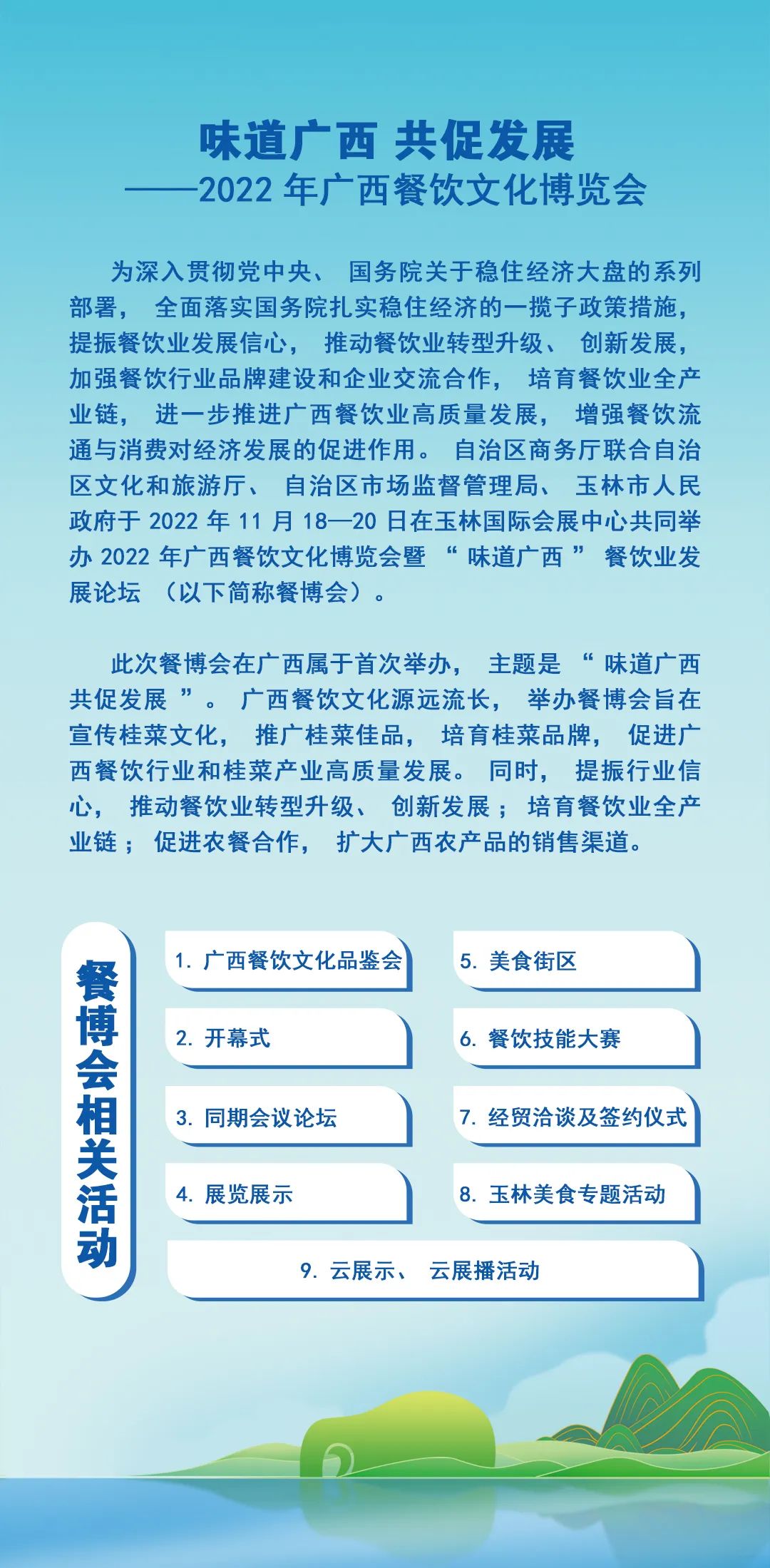 广西壮族自治区商务厅联合广西壮族自治区文化和旅游厅、广西壮族自治区市场监督管理局、玉林市人民政府于2022年11月18日至20日在玉林国际会展中心,共同举办2022年广西餐饮文化博览会暨“美味广西”餐饮业发展论坛(以下简称“餐博会”)。