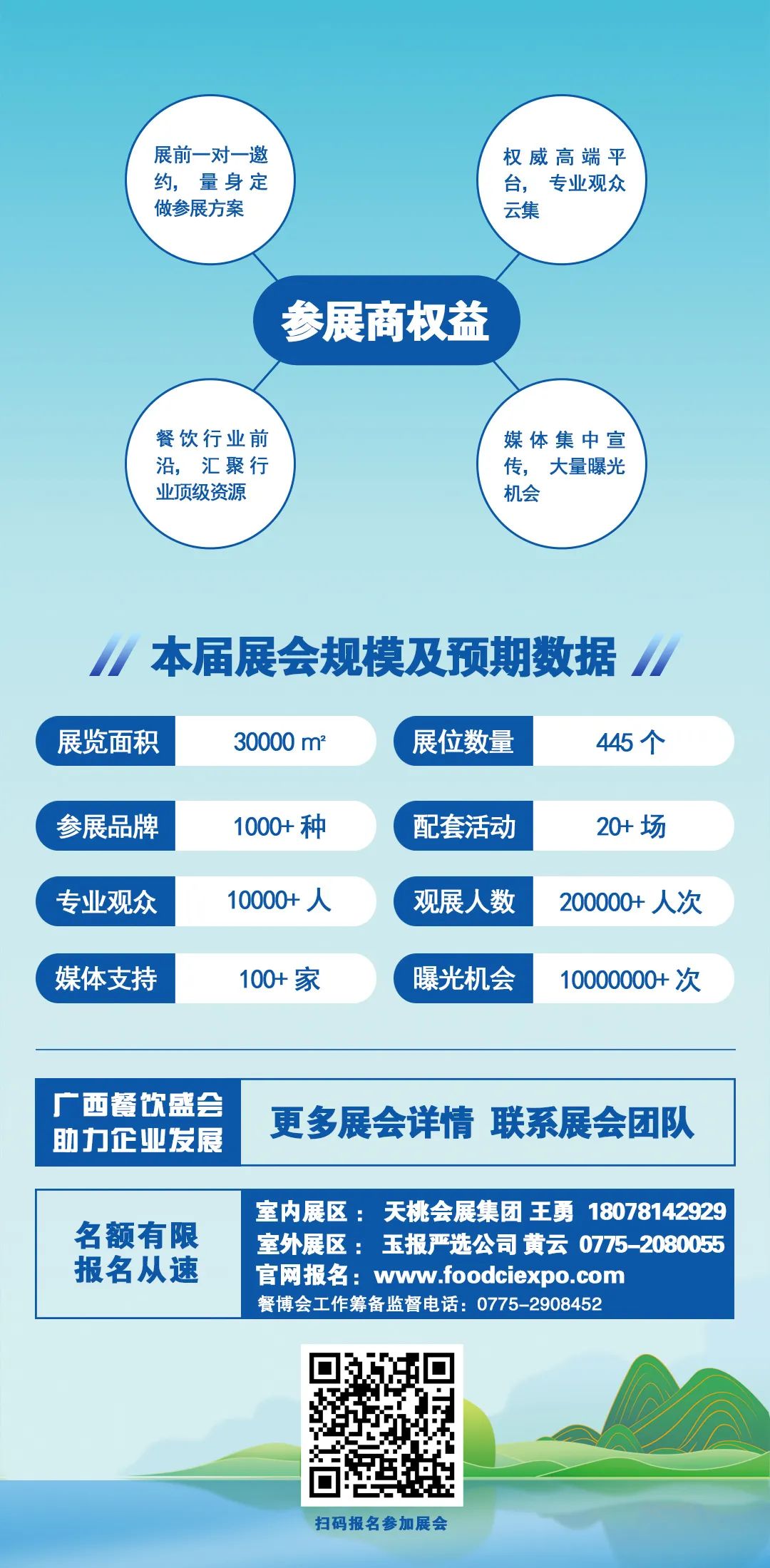 目前餐博会各项筹备工作正在稳步推进,招商招展同步全面启动,餐博会各展馆展位虚位以待,邀您共赴广西餐饮盛会,共享美好“食光”。
