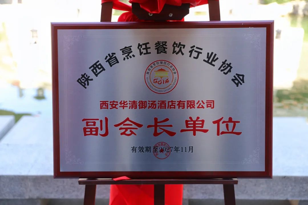 由中国烹饪协会主席团副主席、名厨委常务副主席、国家级高级技师、陕西省烹饪餐饮行业协会会长杜西峰代表省烹饪餐饮行业协会为授予“西安华清御汤酒店”副会长单位会员牌。