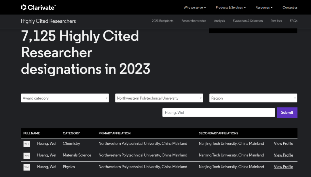 今年,共有来自全球67个国家和地区1300多个机构的6849名科学家入选2023年度名单。部分杰出科学家同时入选多个ESI学科名单:238人入选两个学科,21人入选三个学科,4人入选四个学科,1人入选五个学科,代表他们的学术成果在多个学科领域具有广泛的影响力。黄维院士同时在化学、材料和物理等三个学科入选全球高被引学者名单,代表其学术成果在多个学科领域居于全球顶尖水平,为ESI多学科发展作出了杰出贡献。