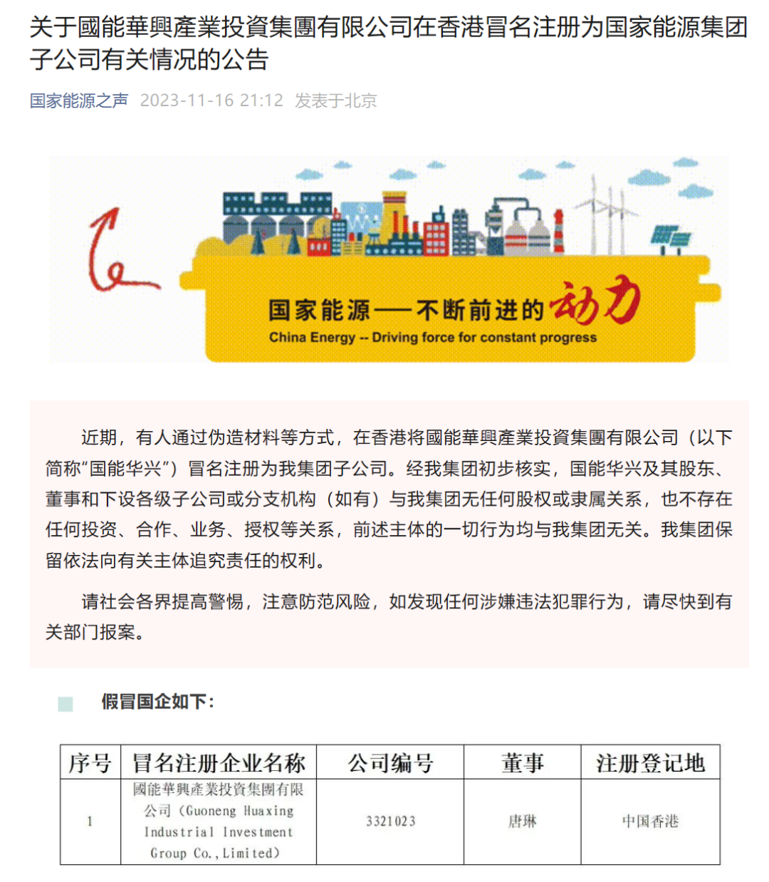 国家能源之声微信公众号11月16日消息,经国家能源集团初步核实,国能华兴及其股东、董事和下设各级子公司或分支机构(如有)与国家能源集团无任何股权或隶属关系,也不存在任何投资、合作、业务、授权等关系,前述主体的一切行为均与国家能源集团无关。国家能源集团保留依法向有关主体追究责任的权利。