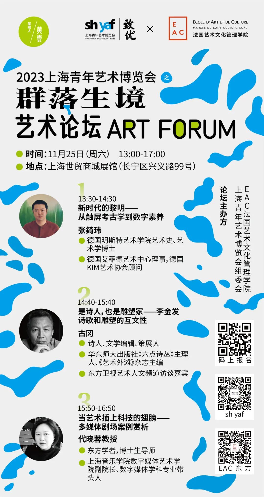 11月25日下午,EAC携手上海青年艺术博览会带来【群落生境艺术论坛ART FORUM】,论坛将特邀3位重磅艺术嘉宾,呈现一系列关于艺术、文学与科技跨界生境的主题分享,共同探讨艺术人文与科技未来方向。以下为群落生境ART FORUM论坛详情: