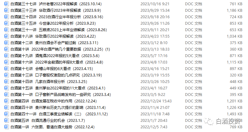 这些内容,是我每周的研究总结,主要按照讲课模式整理出来,每次讲课一个小时,最终整理成文档,从去年12月开始,到现在,一共讲了41讲,从行业分析,到白酒企业年报分析,涵盖了最近一年对白酒的研究,需要研究资料的可以联系我!
