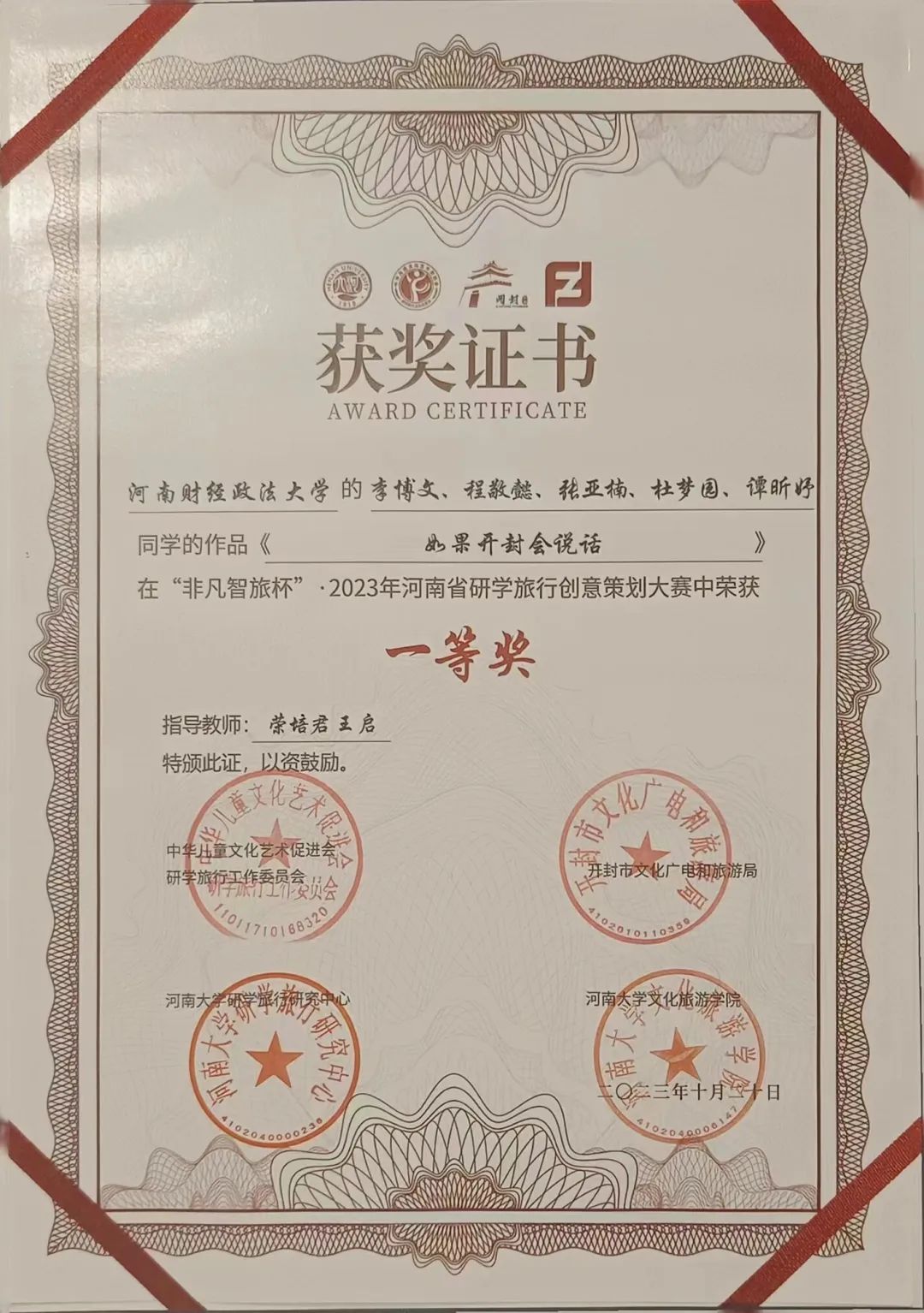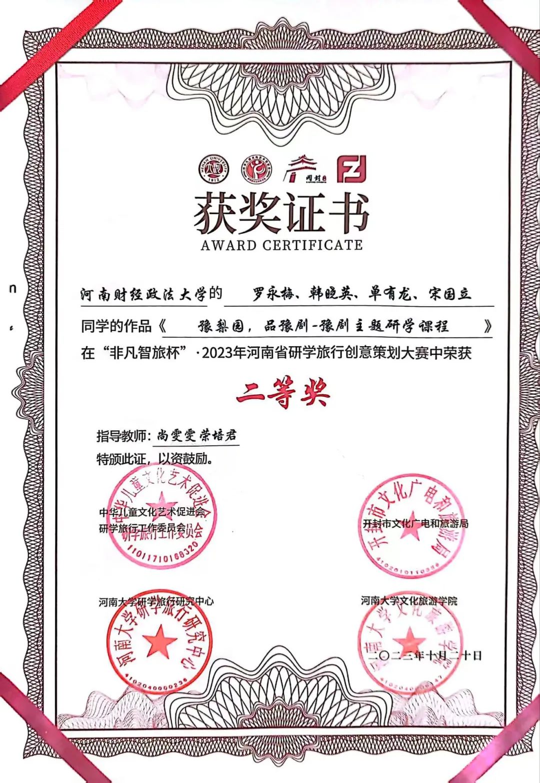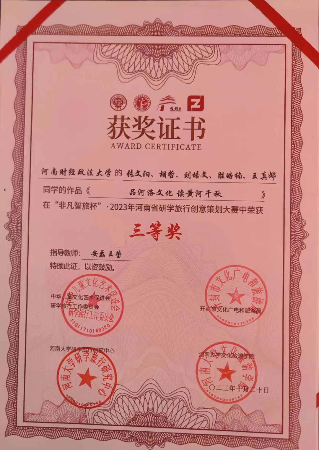 本次创意大赛以“寻迹黄河,豫见中国”研学旅行课程创意设计为主题,由河南文化和旅游厅指导举办。大赛分为初赛、复赛和决赛三部分,在5月至6月的初赛阶段,在荣培君、安磊、尚雯雯三位老师的指导下,我院三支队伍依据自身专业知识,充分发挥团队能力,以鲜明详实的作品成功入围决赛。在决赛的现场展示和评委提问阶段,我院学生以大方得体的表现,认真流利的回答得到评委老师们的充分肯定。最终,三支队伍“听懂掌声队”、“豫州班”和“成群结队队”分别获得了大赛的一等奖、二等奖和三等奖,充分展示了新时代大学生的精神风貌。