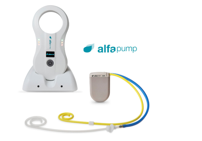 alfapump®系统是一个完全可植入的泵系统,在腹水形成时收集腹水并将其移入膀胱,通过排尿自然排出体外。植入过程可以在局部或全身麻醉下进行,时间不超过一小时。植入后,患者与alfapump®系统的互动很少。病人只需将一个手持充电设备放在alfapump®上,就可以通过皮肤为alfapump®无线充电。在充电时,来自alfapump®的数据被传输到这个充电器。医生在随访时可以访问这些数据,并可酌情改变设置。