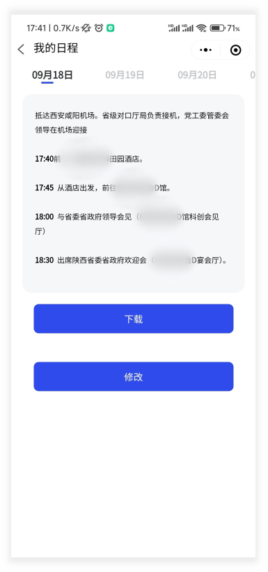 录入以后,嘉宾即可登录小程序接收和查看个人展会期间的行程安排和酒店、车辆。