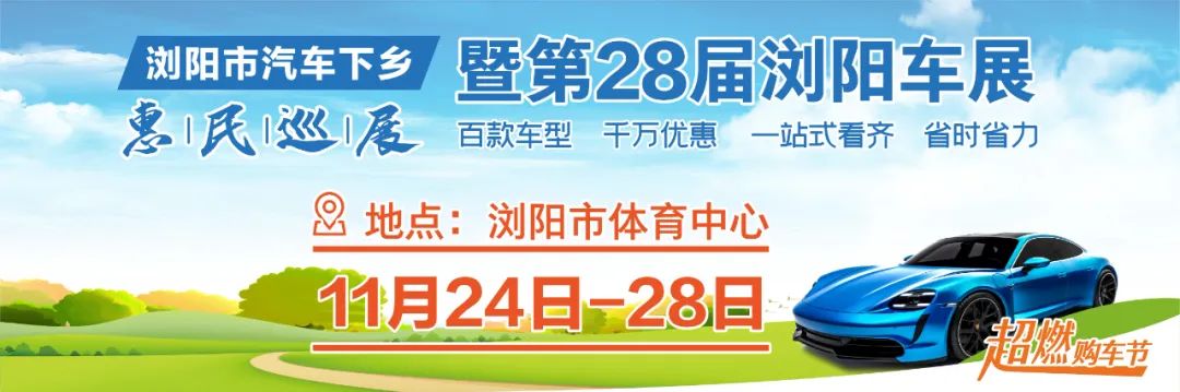 浏阳市汽车下乡惠民巡展暨第28届浏阳车展,携钜惠来袭!本届车展是由浏阳市人民政府主办,浏阳市商务局、浏阳经开区管委会、大瑶镇人民政府、镇头镇人民政府、沿溪镇人民政府、洞阳镇人民政府、浏阳市融媒体中心承办,历时5天,主打惠民促销,参展商福利力度空前。