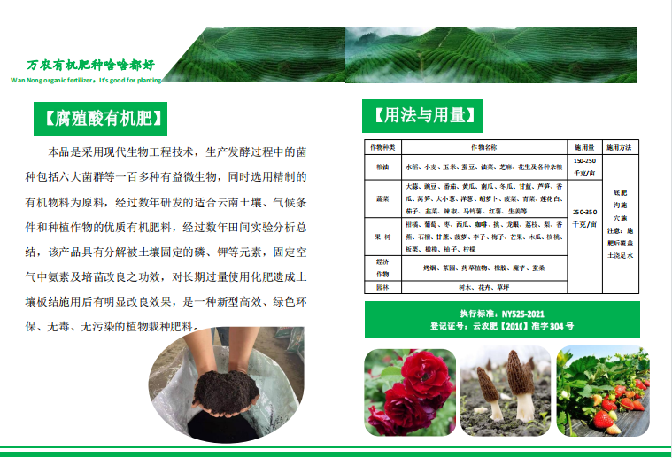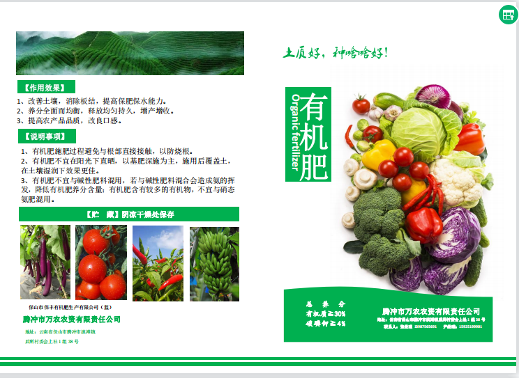 腾冲市万农农资有限责任公司根据土壤微生态学、气候、植物营养生理学原理研制而成的有机肥料,本产品营养丰富,绿色环保,在粮食种植、花卉育苗种植、茶叶种植、蔬菜种植、水果种植、烟草种植、育苗基质等领域广泛应用。公司自成立以来,始终坚持保持初心,为消费者生产最优质的有机肥料,提高农场品品质,改良口感。与农科院专家经过数年田间实验分析总结,本公司生产的产品具有分解被土壤固定的磷、钾等元素,固定空气中氮素及培苗改良功效,对长期过量使用化肥造成土壤板结施肥后有明显改良效果,是一种新型高效、绿色环保、无毒、无污染的植物栽种肥料。
