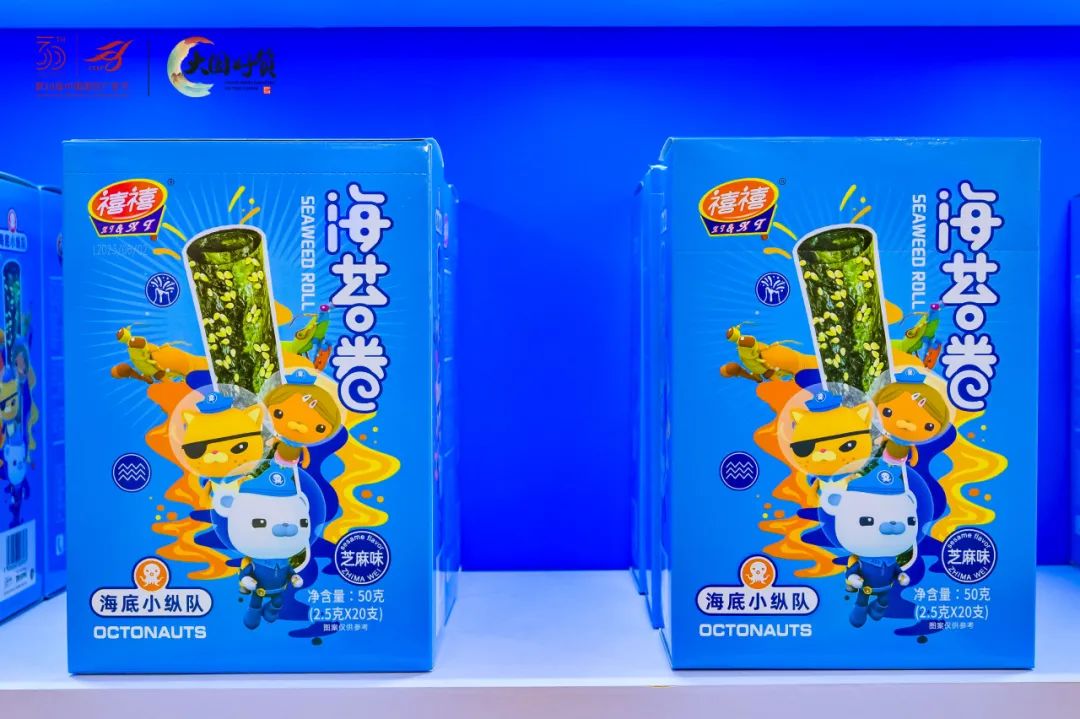力绿集团携“欢乐禧禧”、“农亨”品牌闪亮登场,以蓝色海洋为主线的展馆,营造海洋的氛围,引领观展人员们沉浸在海苔的独特魅力中,切身与产品进行对话,深度了解品牌,爱上品牌。