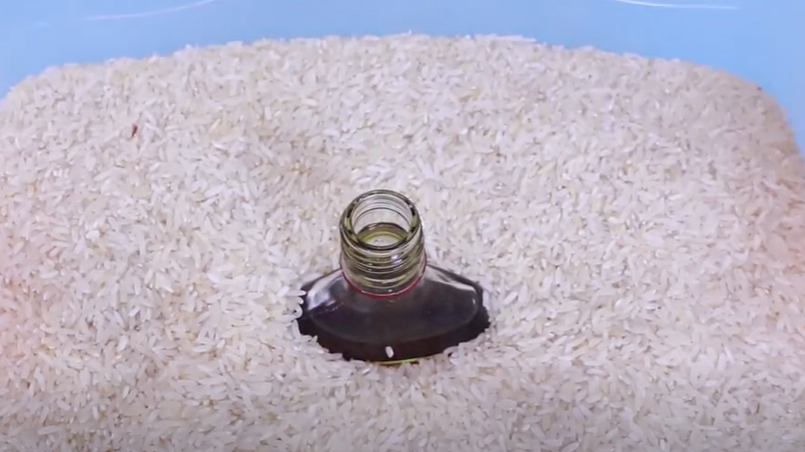 白酒第三个用途,还可以有效的防止大米受潮生虫变质。直接将白酒放进大米里面,我们给它放进去的时候也是有技巧的,我们的瓶口一定要高过大米,如果低于大米的话,大米很容易掉落进去。放好之后,我们可以将它瓶盖拧松一些,或者直接打开,因为白酒里面含有酒精,消毒又杀菌,释放出来可以杀死大米里面的米虫,我们盖上密封盖子保存效果更加的好,这样大米放上一年都不会坏掉。