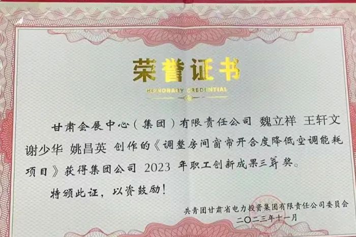 会展集团创新成果再添硕果——《调整酒店客房窗帘开合度降低空调能耗项目》喜获甘肃省电力投资集团2023年职工创新成果三等奖