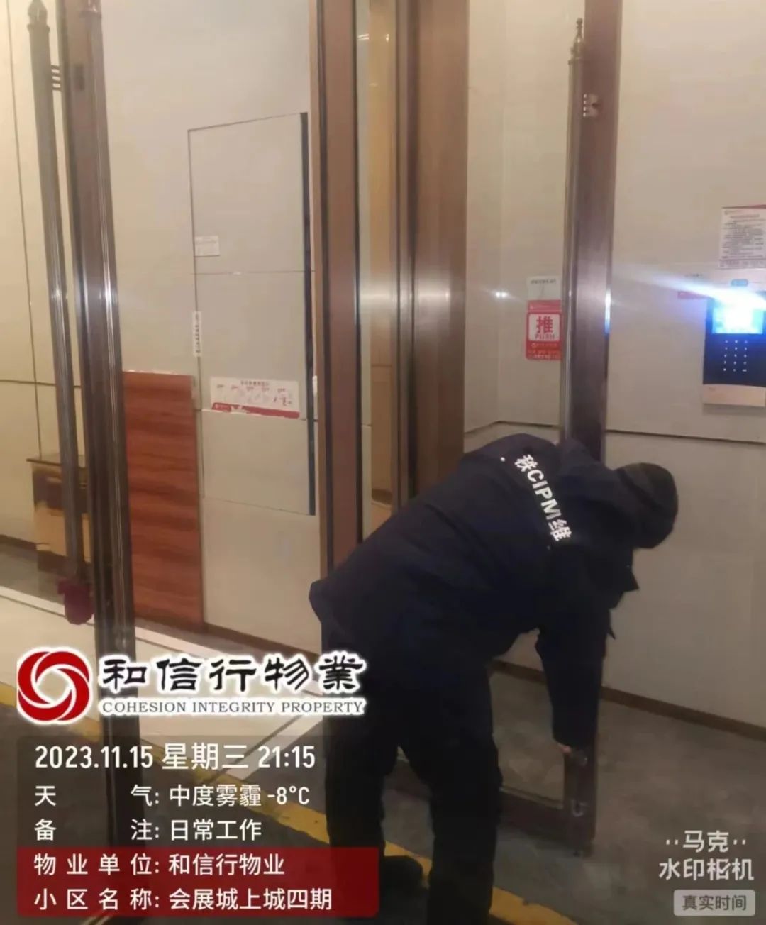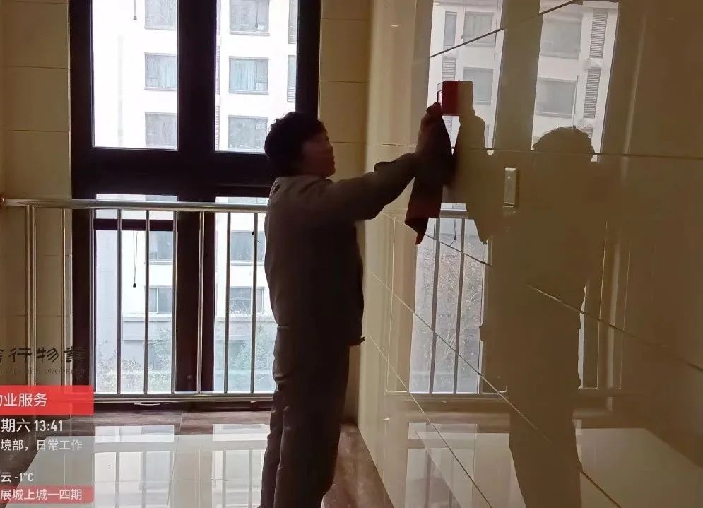 二、完成电梯前室瓷砖楼梯扶手擦拭工作;