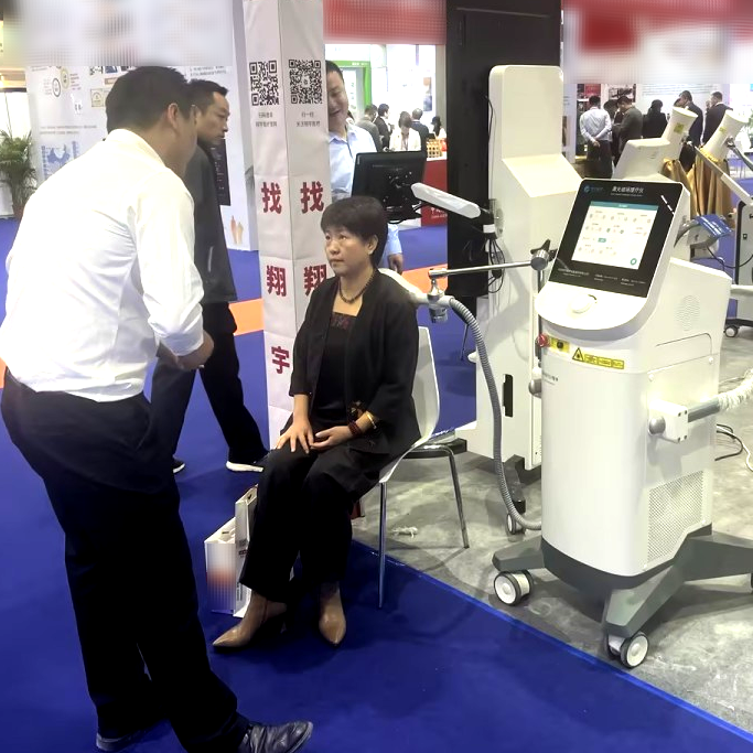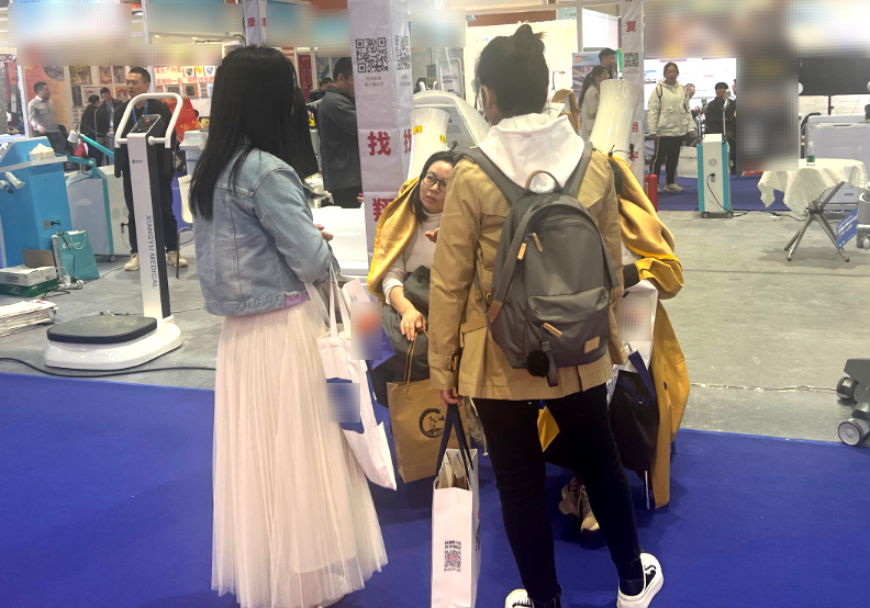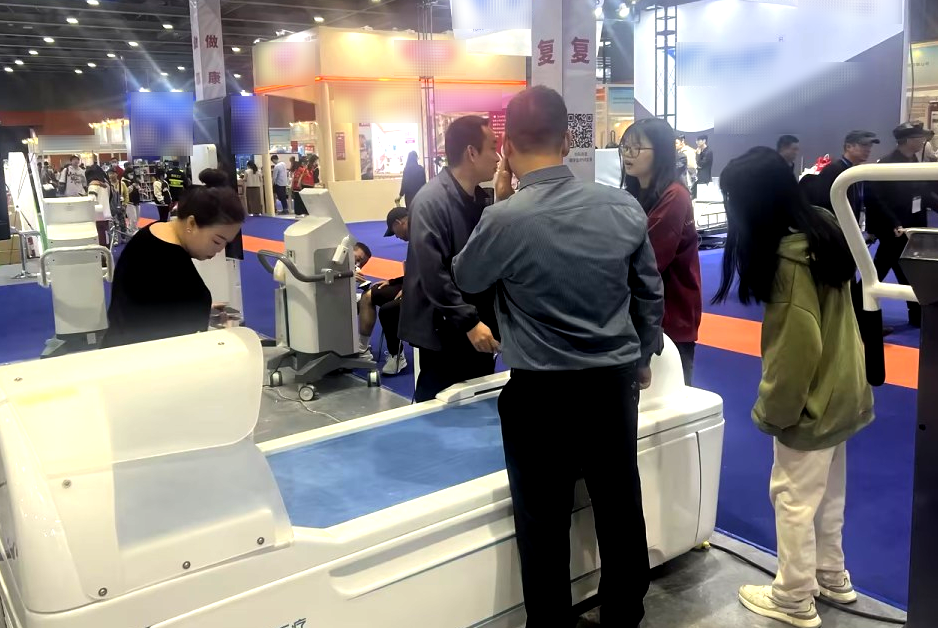△中国老龄产业协会执行会长吴世民莅临翔宇展位参观指导,在体验全身音波垂直律动康复训练系统后对其大加赞赏。