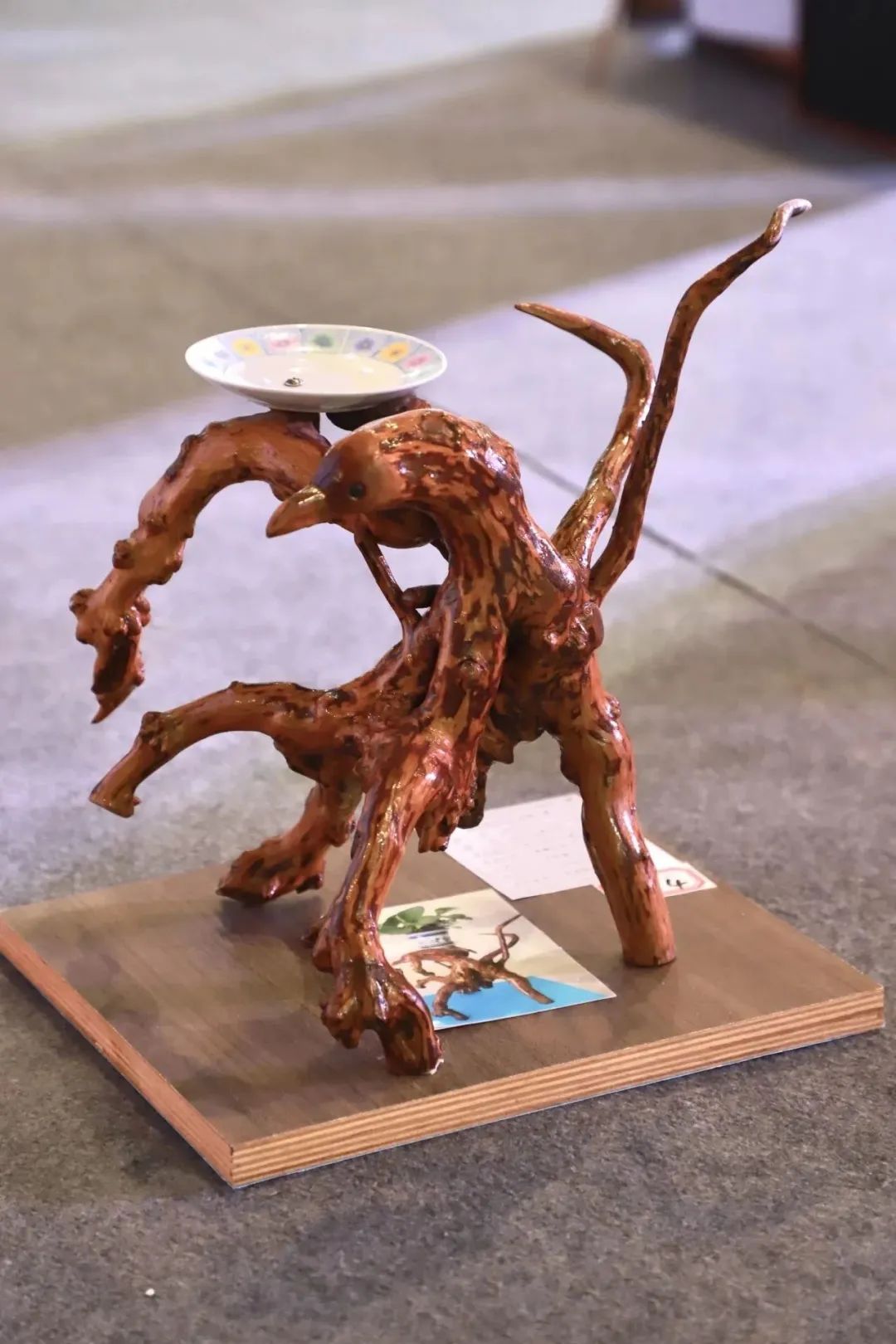 作品简介:根雕《雄鹰花架》采用天然树根,根据其生长形态,发挥想象就形而造型,把树根修剪雕刻成展翅欲飞的鹰,并可立地观赏可作花架使用,非常雅致。