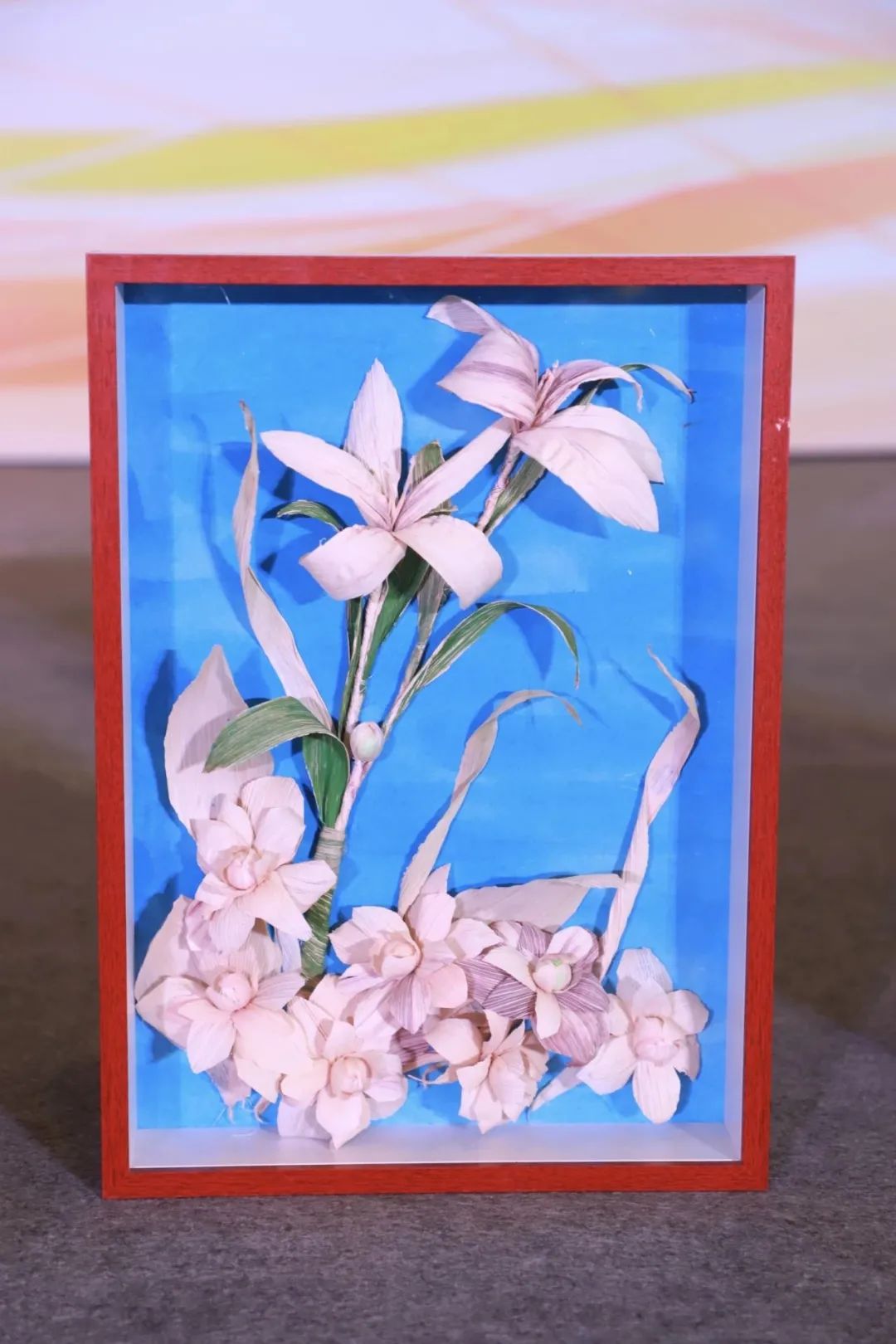 作品简介:一枝一叶皆风景。用玉米苞衣剪成花瓣,用玉米苞衣包黏土做花心,再用绳子把花瓣绕着花心层层叠加形成花朵,用绘画、剪贴粘合创作成优美手工花。