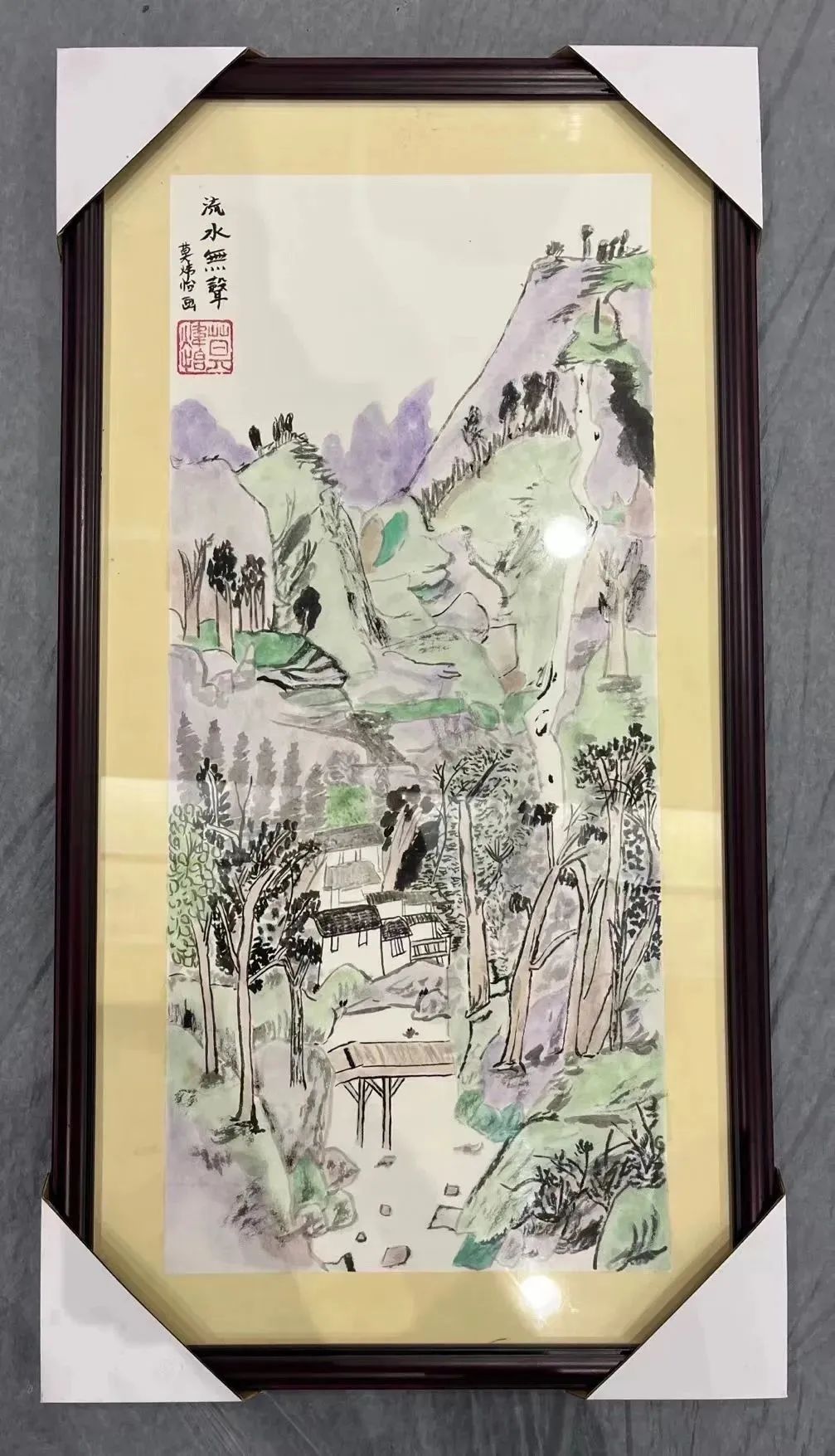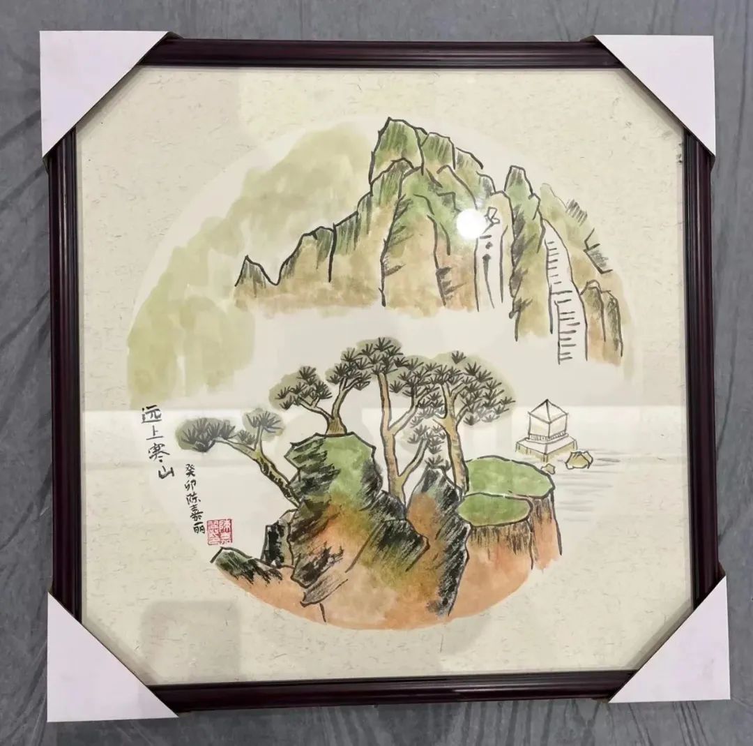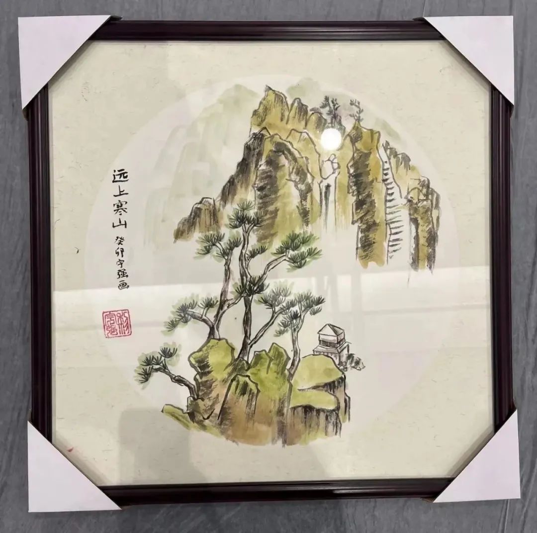 作品简介:古有诗云:“远上寒山石径斜,白云深处有人家”。这幅作品是学生画作创意,就脱胎于这首诗。诗中有画,画中有诗,初见此画,即有一种“诗画融于一体”的感觉。此画中山峰峻拔,足见其险;白云悠悠,又足见其闲。飞瀑流泉,可观其势;茂林别木,可会其意。将这样一幅画作置于室内,其屋必雅,其室必致。等同于雄山俊水,纳于三尺之地;天地大美,尽在一眸之间。
