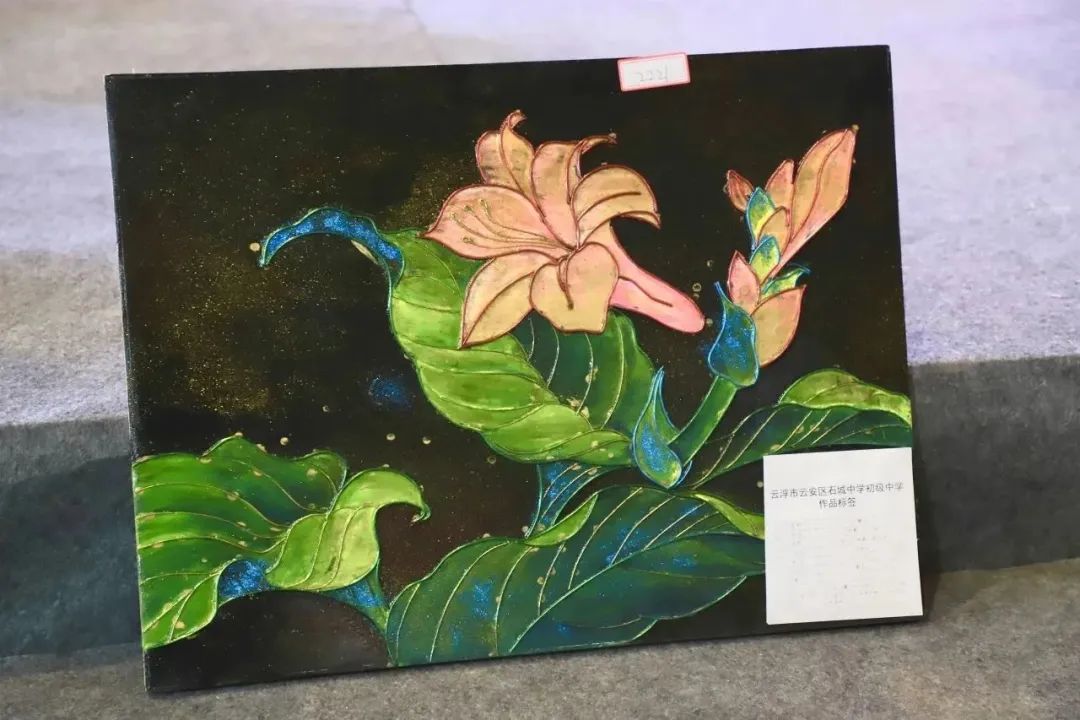 作品简介:以国画玉簪花的线描形式去创作一幅国风漆画,加以多种材料,以拼、贴、画等多种手法进行创作。