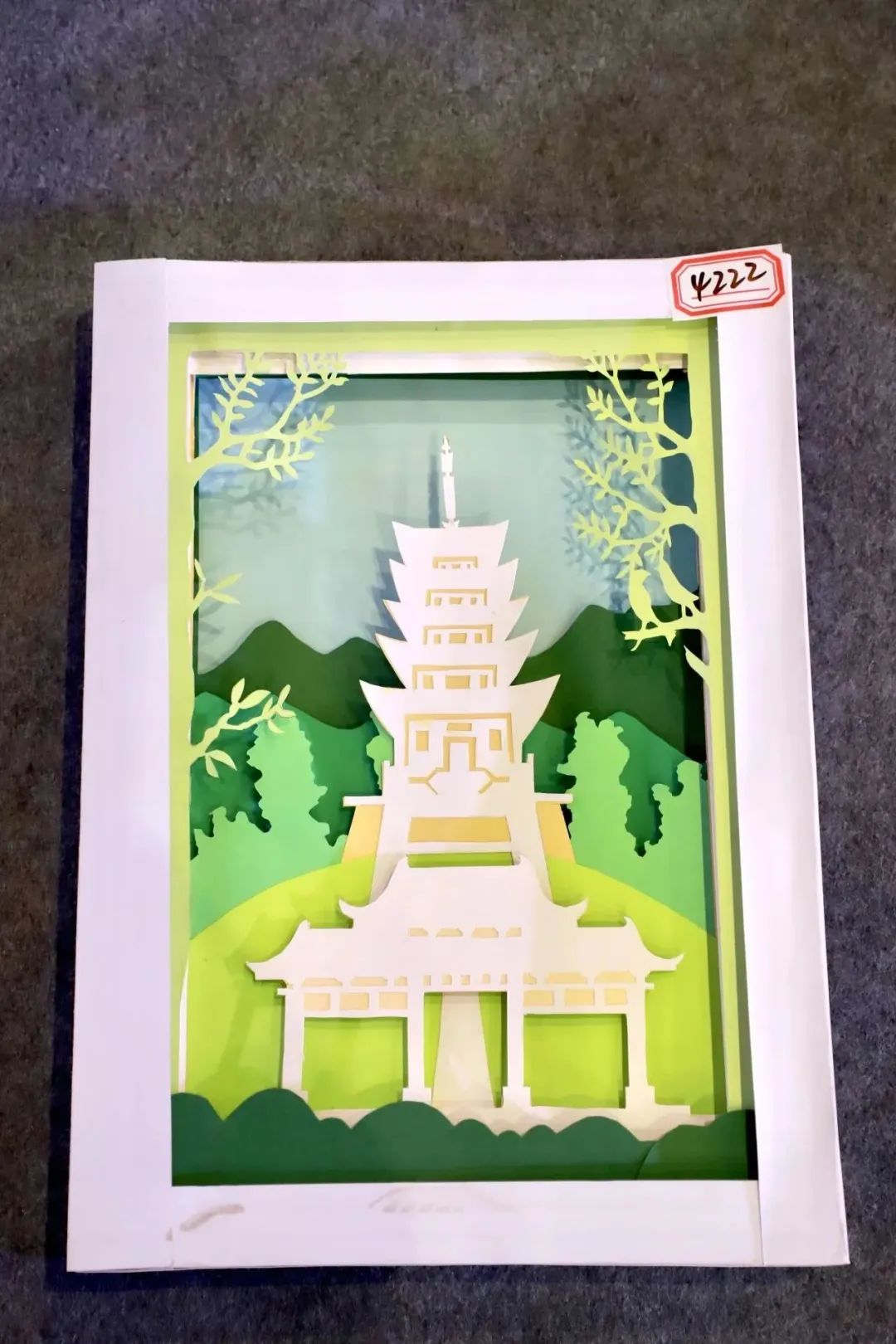 作品简介:本作品是立体纸雕礼盒艺术,创作是以新兴金台山智慧公园风景为主题。材料是用各色卡纸,雕刻出春天的金台山的风景之美,具有立体效果和观赏性。