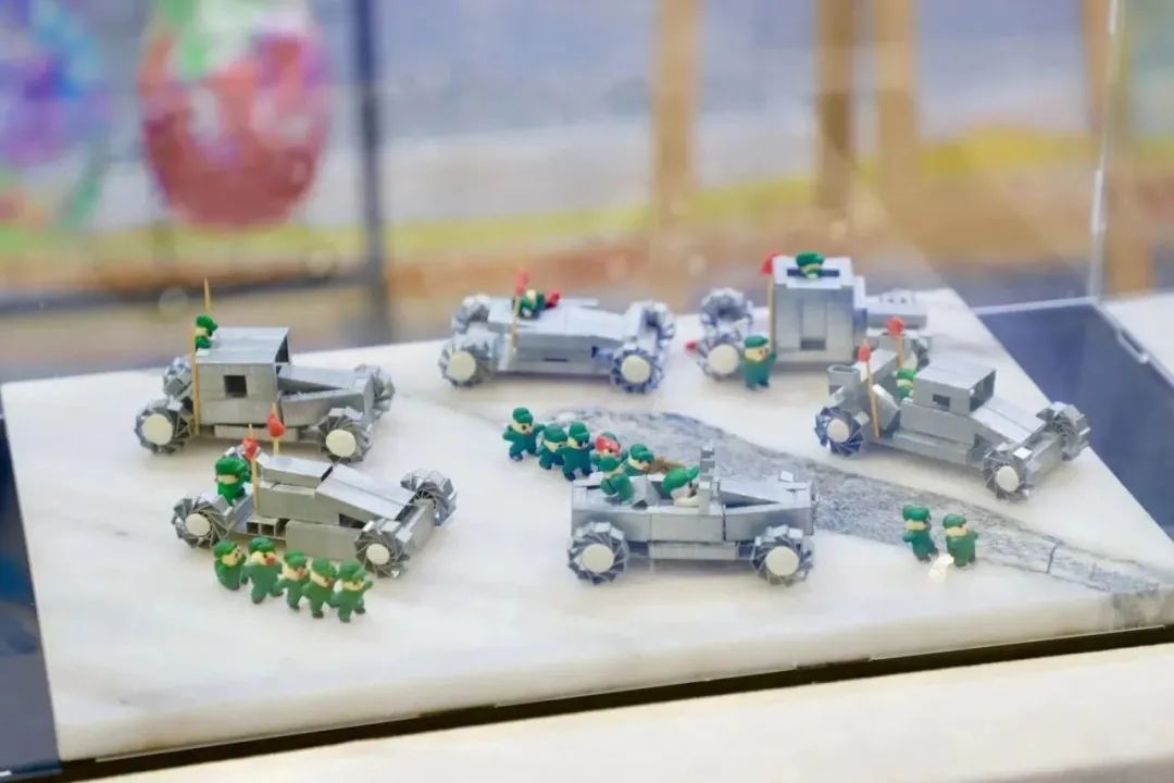 作品简介:这个作品学生们利用订书针的独特性,把订书针分拆组合成不同造型的车辆,最后利用衬底石头的纹理布局加上不同方向的摆放车辆,同时添加了许多军人造型的小人,形成了一支勇往无敌的军队,象征着祖国繁荣昌盛,人民团结一致的精神。