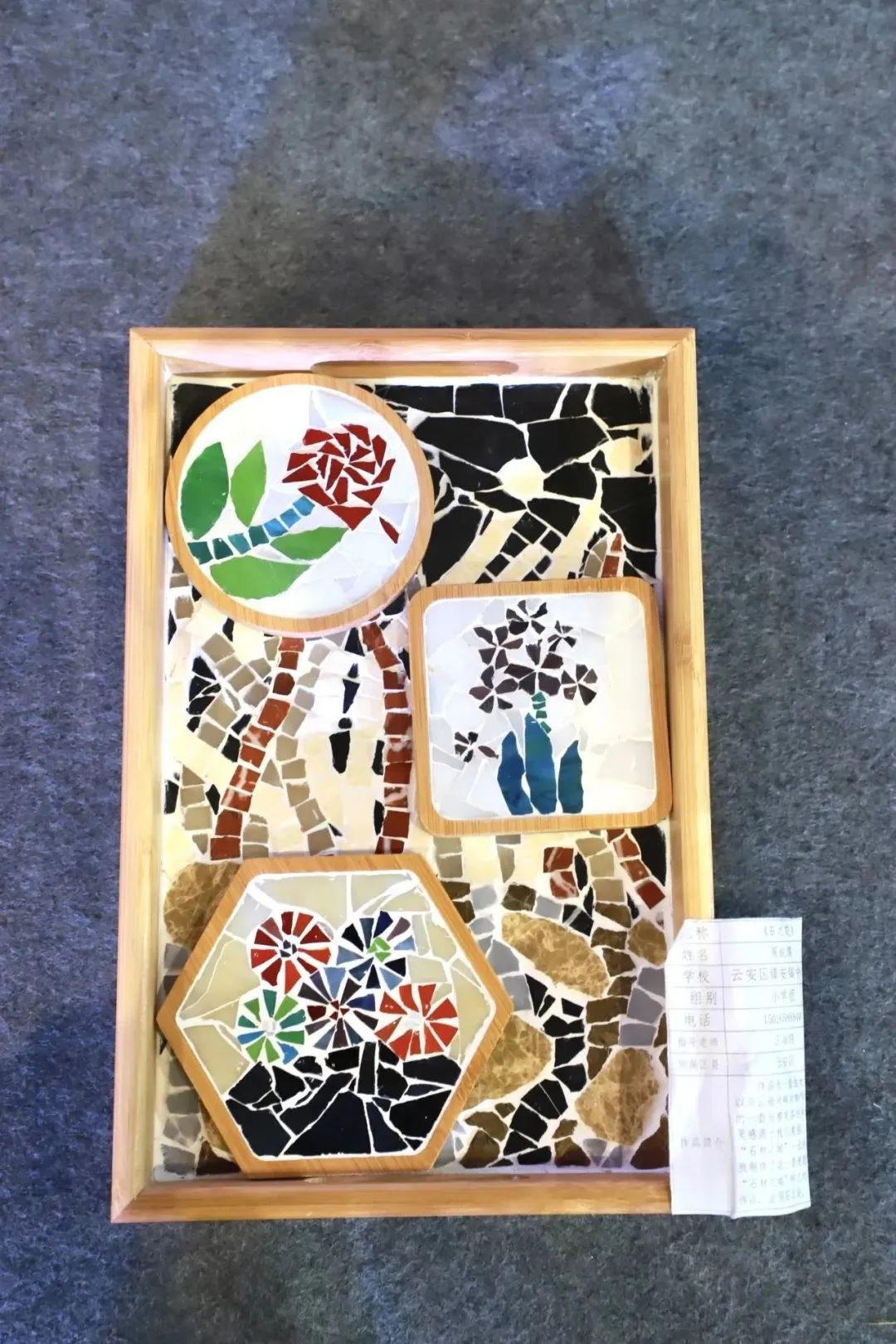 作品简介:作品为一套由大理石以及云母片碎片制作而成的一套马赛克茶托和杯垫,灵感源于我们美丽、淳朴的“石材之城”--云浮,于是我制作了这一套更能体现“石材之城”特色的马赛克作品,呈现石之美。