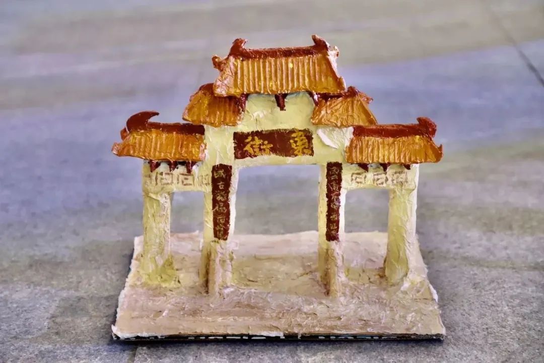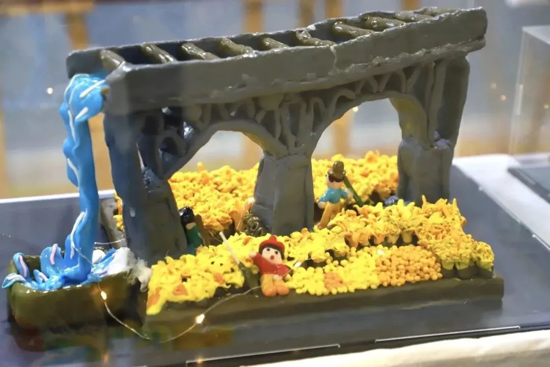 作品简介:作品中学生们在了解长岗波渡槽的结构和历史故事后,通过软陶泥的可塑性,利用硬纸板作为骨架,用软陶把桥雄伟的造型和稻谷丰收的美好场景用手工一一捏作出来,表现了学生们积极向上的美好生活向往。
