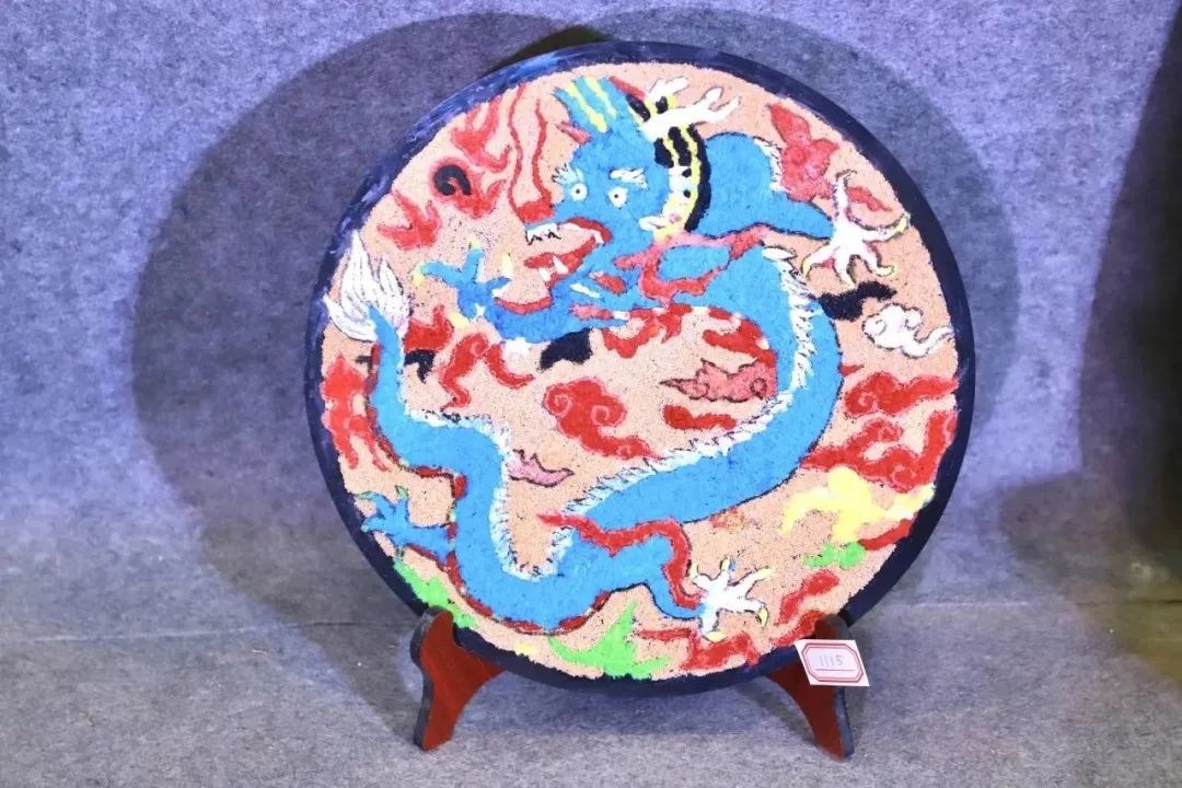 作品简介:作品是一副用综合材料构成的平面手工,龙身及图案用纸浆拼画而成,背景用细沙铺垫,呈现出中华民族传统龙的图案,颜色对比强烈,构图饱满,疏密有致,突出“石都文化,传承有我”的主题。