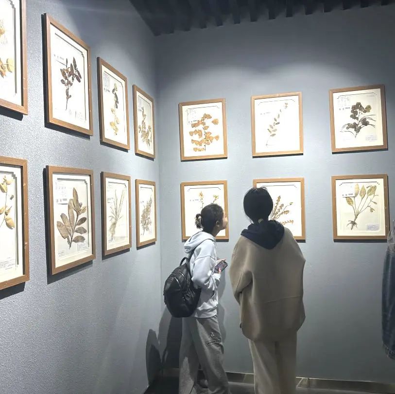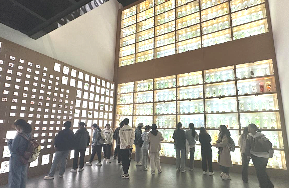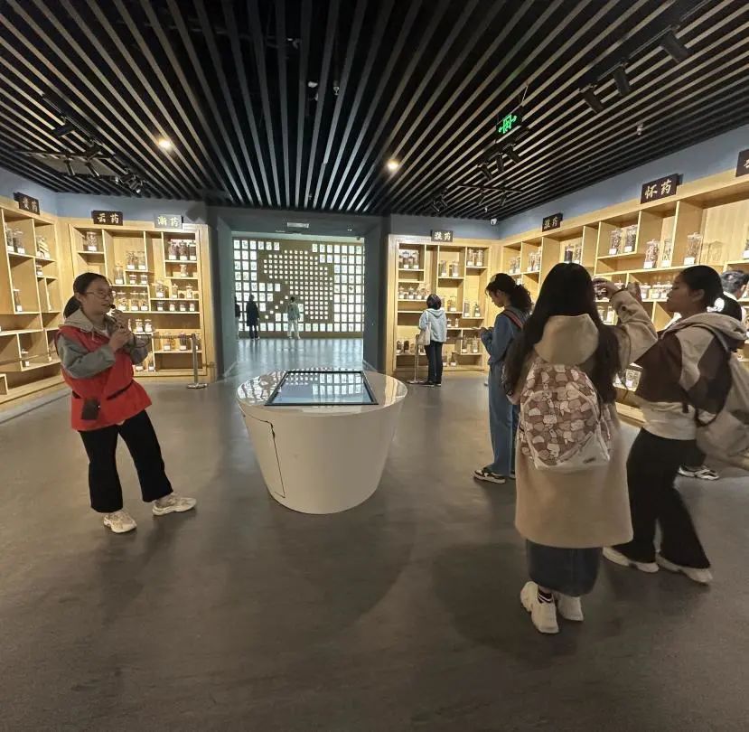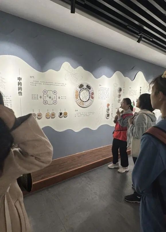 随着讲解员的引导,同学们一同到达博物馆的中药饮片展厅。这些药材被放在混合药剂中,保持着天然的形态和颜色。