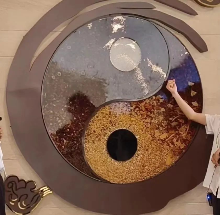 在养生馆的门口墙壁上悬挂着一幅由中药材制成的阴阳鱼图。走进养生馆,首先映入眼帘的是儒释道等多个学派的主要思想展示。从中不难看出,中医养生文化的发展其实是和儒释道的思想密切相关的。