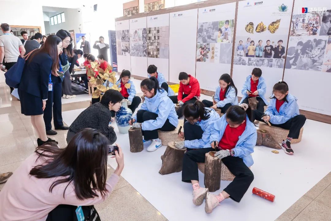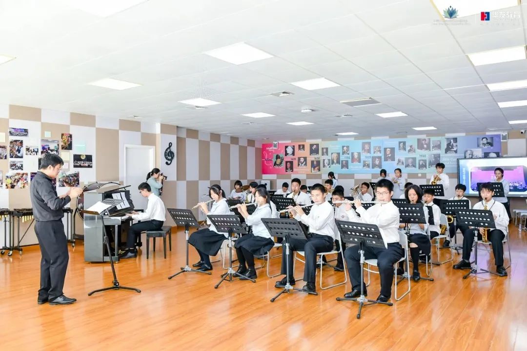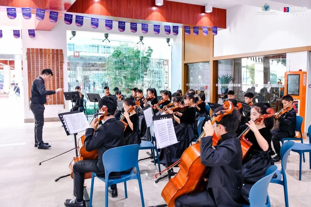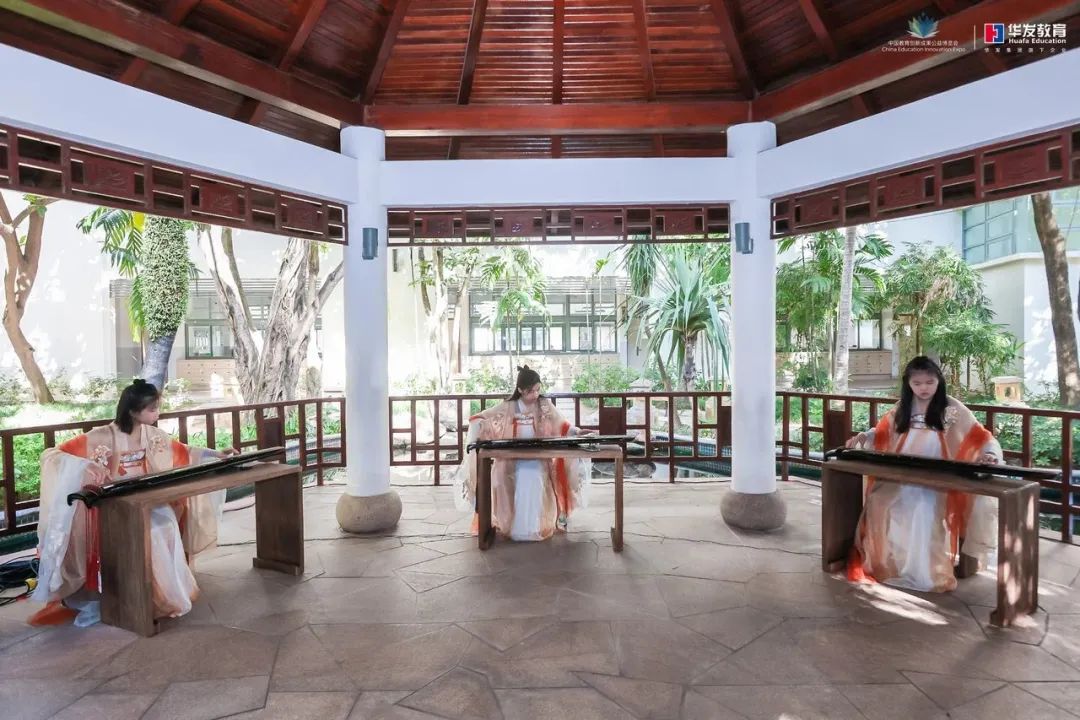 华发教育还组织学生社团送上了丰富多彩的艺术表演。不仅有学生爵士社团在入口处“先声夺人”吸引视线,还有精彩的弦乐合奏,让现场观众大饱耳福。在学校园林的凉亭一角,师生们带来的古琴曲目,悠扬婉转,韵味深远,参会者不由得停下脚步,凝声静听。