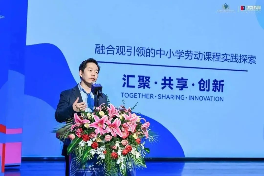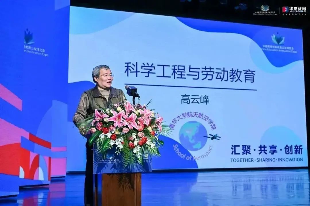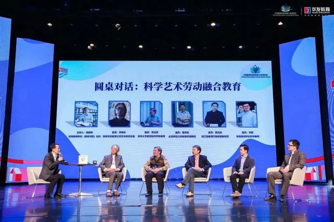 在容闳学校文体中心二楼,北京师范大学教授檀传宝,清华大学航天航空学院教授高云峰、浙江省教育厅教研室教研员管光海、华发教育艺术教育总监常晓冰、容闳学校科学教师李超,正围绕着“科学艺术劳动之融合·创造·生长”进行分享交流。昨天的教博会主会场开幕式上,一位中科院院士分享了“新时代的劳动教育”,提出劳动教育是“五育融合”的重要突破口。今天的容闳学校分会场专业论坛,五位专家和老师就这个话题进行了更深层次的探讨。