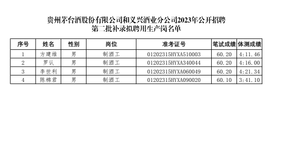 根据《贵州茅台酒股份有限公司和义兴酒业分公司2023年公开招聘公告》, 因聘用人员出现流失,公司在符合条件的原应聘人员名册内,根据公告规则按总成绩由高到低依次递补生产岗4人,现将拟递补聘用人员名单进行公示。