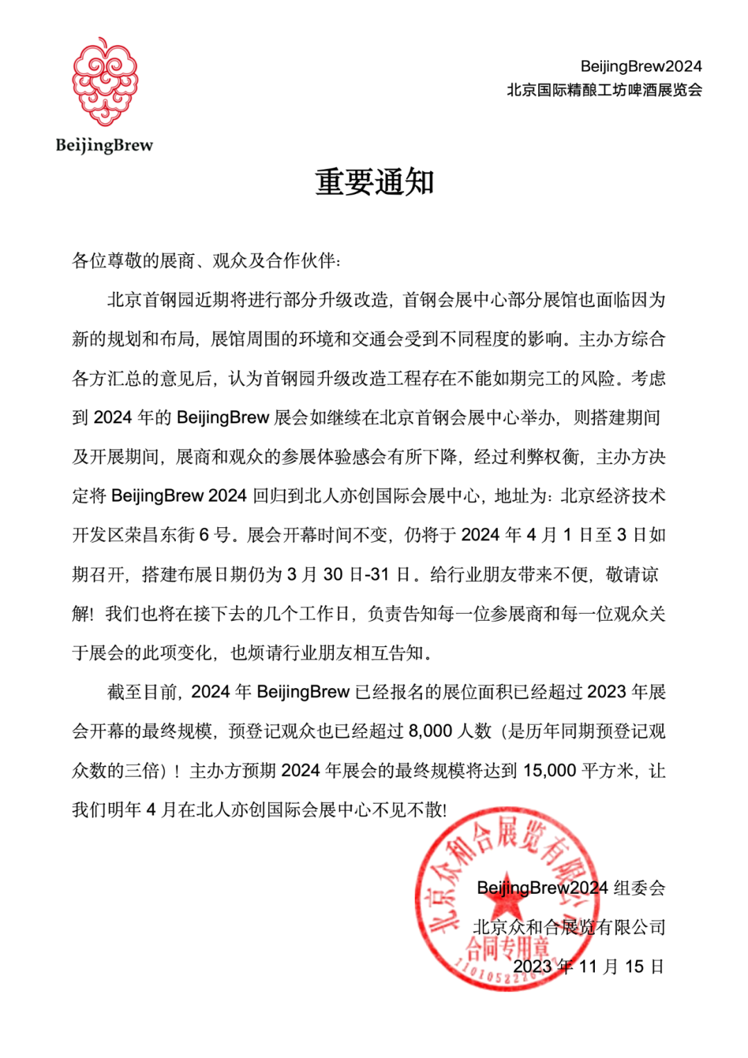 北京首钢园近期将进行部分升级改造,首钢会展中心部分展馆也面临因为新的规划和布局,展馆周围的环境和交通会受到不同程度的影响。主办方综合各方汇总的意见后,认为首钢园升级改造工程存在不能如期完工的风险。考虑到2024年的BeijingBrew展会如继续在北京首钢会展中心举办,则搭建期间及开展期间,展商和观众的参展体验感会有所下降,经过利弊权衡,主办方决定将BeijingBrew 2024回归到北人亦创国际会展中心,地址为:北京经济技术开发区荣昌东街6号。展会开幕时间不变,仍将于2024年4月1日至3日如期召开,搭建布展日期仍为3月30日-31日。