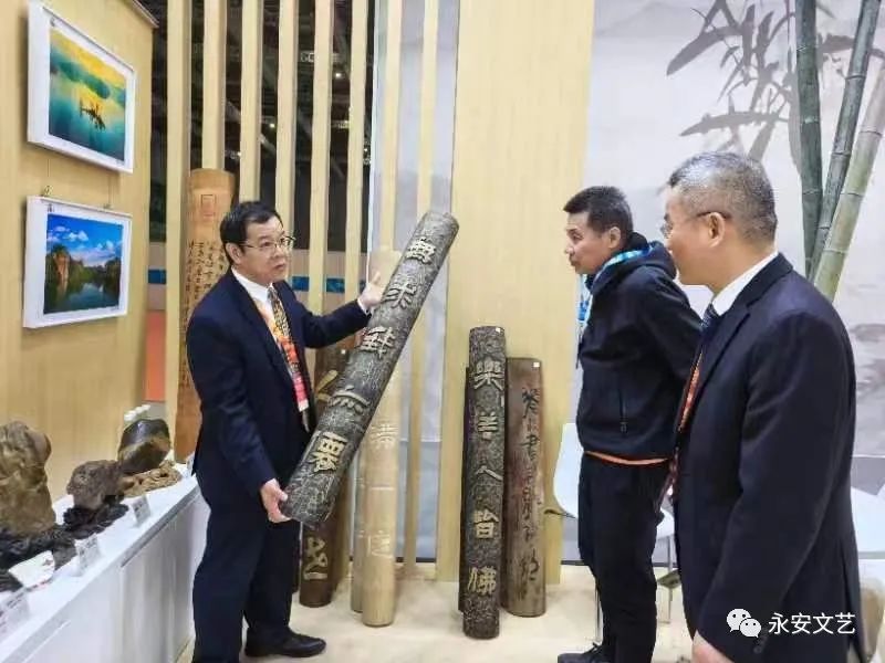 好风凭借力,作为竹博会文化展区的重要组成部分,依托竹博会这一高端平台,永安文艺展会第一次到省外办展,而且是走进了国家会展中心,走进了长三角文博会,这是永安文艺事业发展进程中的一次重大突破,也是一次永安文艺创作水准的重要考验和精彩呈现。 永安市文联高度重视,对此次展览进行了精心的筹备,8月份接到参展任务后,立即组建工作专班,选定“沪明情 竹乡韵”作为展览主题、组织精干力量开展主题创作,并向全市征集参展作品,最终遴选出本次展出作品近百件,其中书画类作品20件,刻字类作品20件,奇石类作品30方,摄影作品20幅,集中展示推介永安的福文化、竹文化。