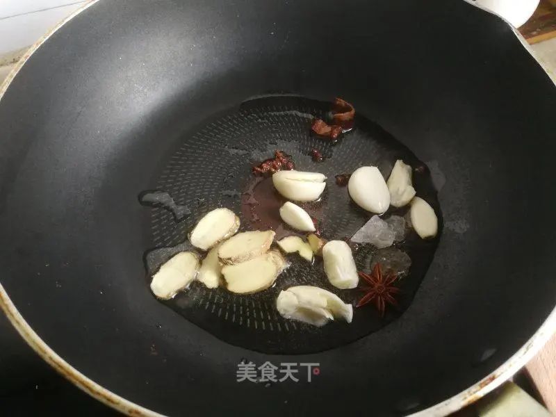 3. 锅中放油,放入冰糖、姜蒜、香料炒香。
