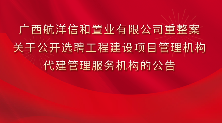 根据重整计划,本案将引入共益债投资款对航洋信和公司投资开发的位于南宁市良庆区五象大道401号“南宁航洋信和广场”项目裙楼商业B4-F7层精装修工程及配套机电安装工程进行续建并完成二次消防验收及办证等相关手续,保证“南宁航洋信和广场”项目开业运营。为使重整计划得以顺利执行,现管理人拟通过公开选聘的方式选定工程建设项目管理机构、代建管理服务机构,并将有关事项告知如下: