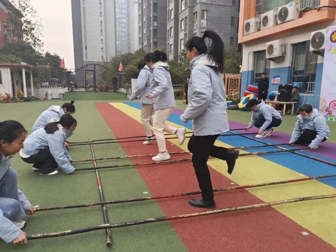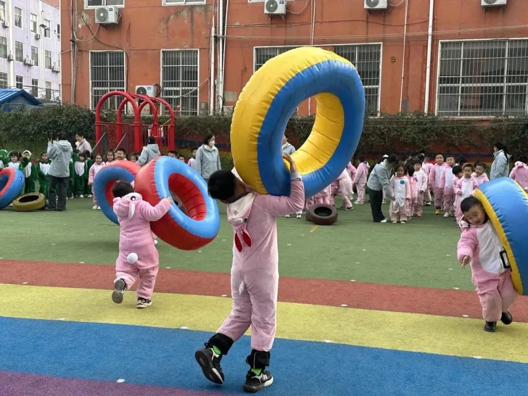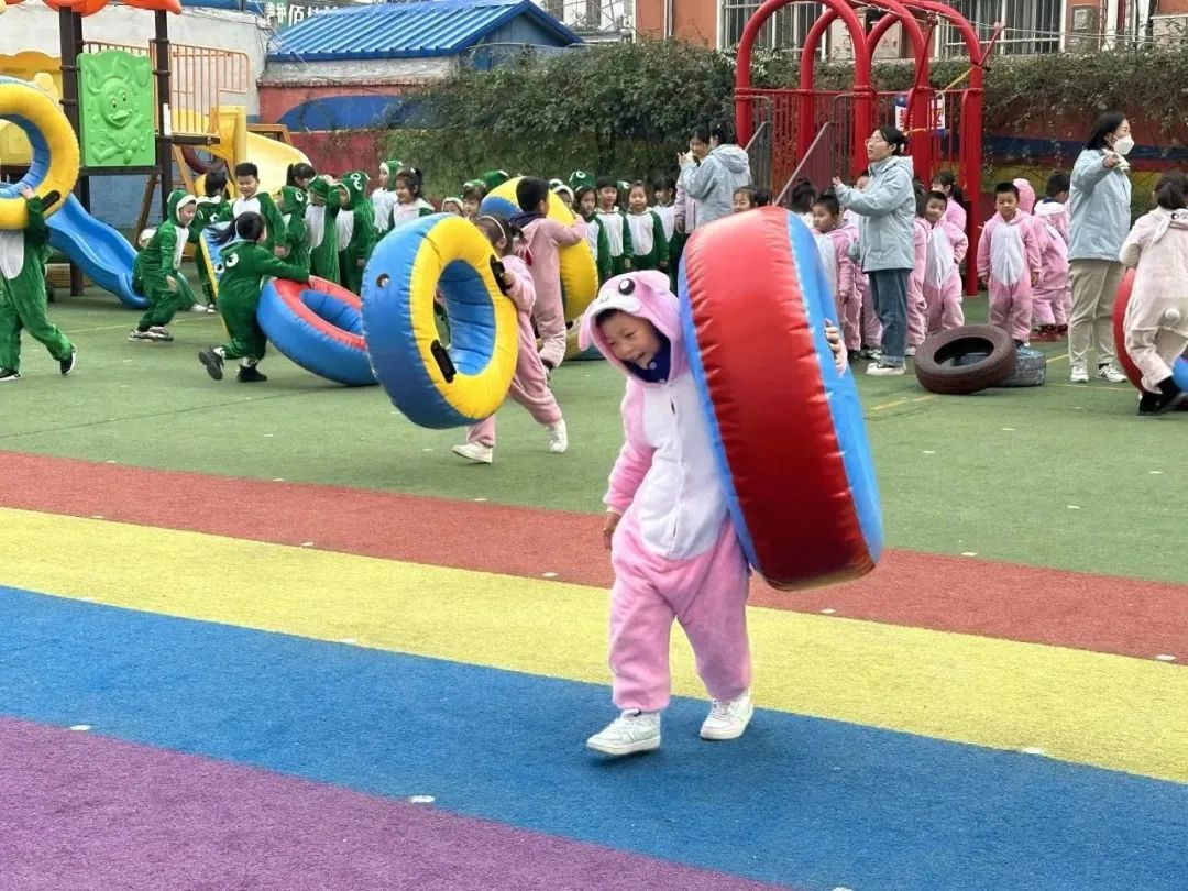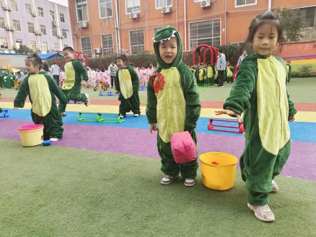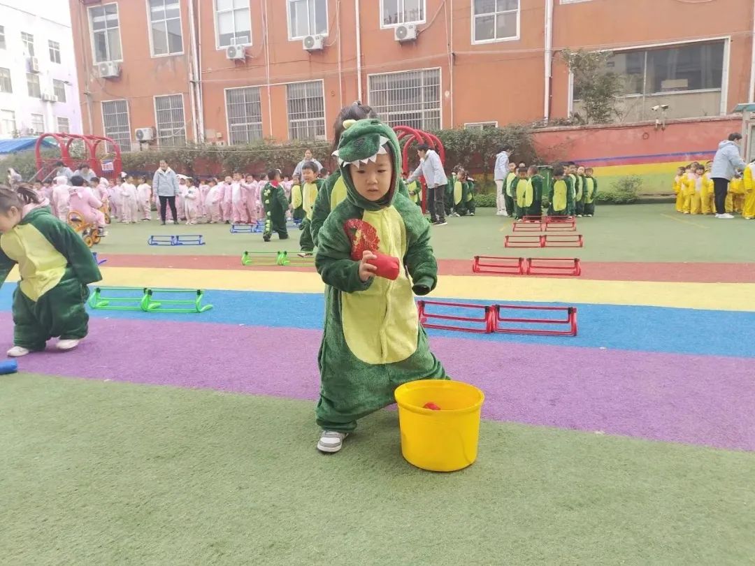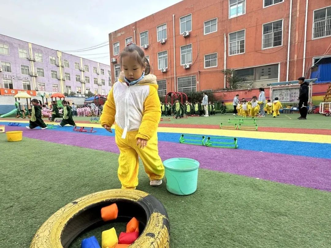 组织进行游戏障碍投球,帮助孩子发展协调性和灵活性。装扮成动物的孩子们跳过障碍设置到达目的地把沙包投进圆桶里,提高投掷能力和准确性。