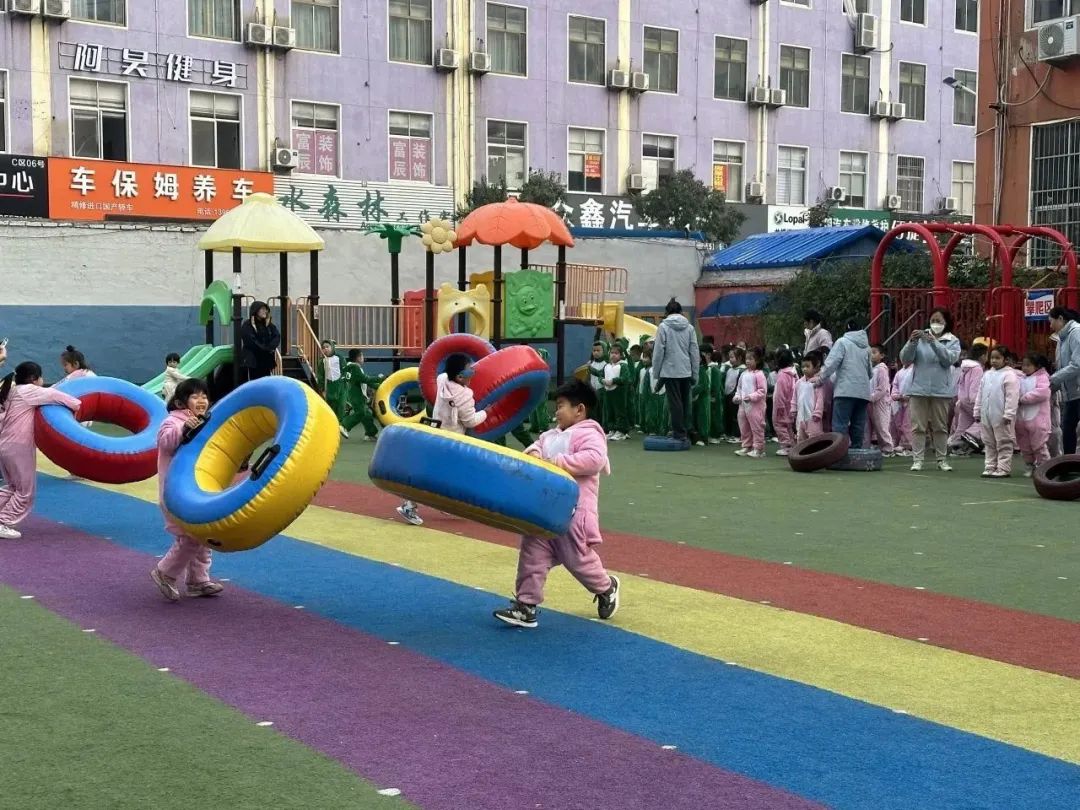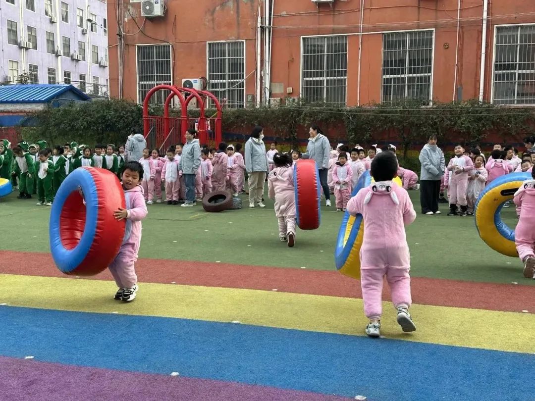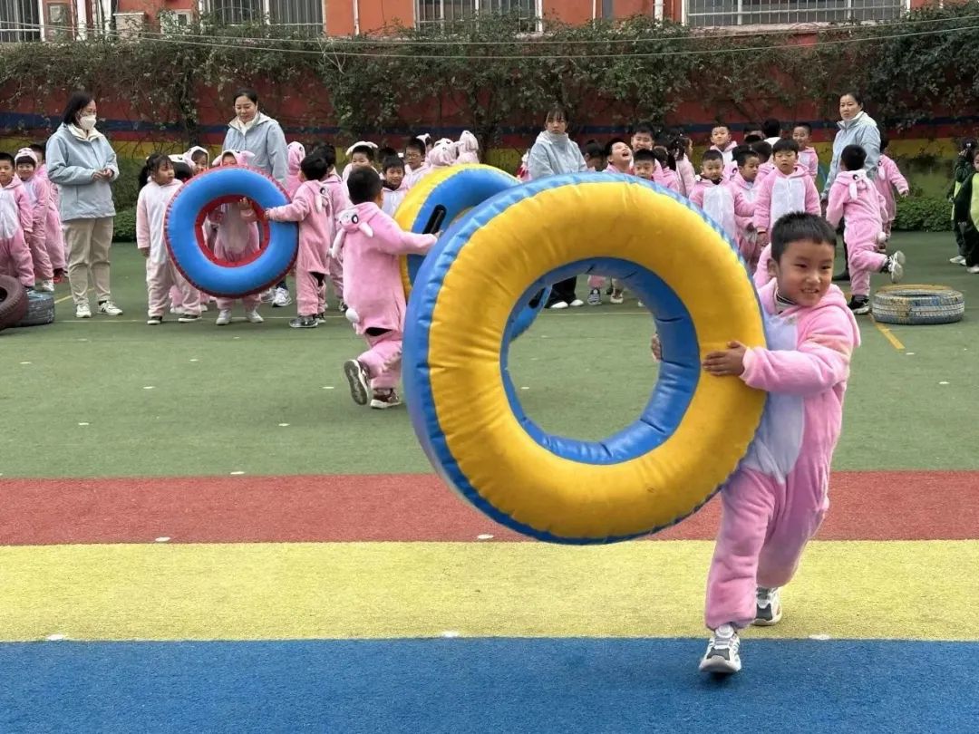 游戏滚充气轮胎 ,孩子们充分发挥不怕困难,勇往直前的意志品质和合作精神,个个都热情高涨,生龙活虎,自信满满,站在起跑线上,准备好充气轮胎,认真听口令,并按时完成了比赛。