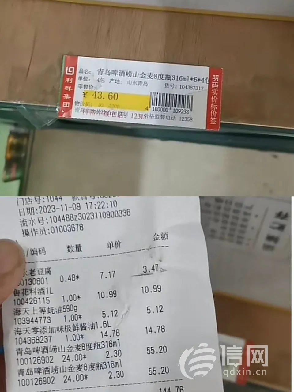 11月9日,李先生到青岛西海岸新区灵山湾路的利群家乐城超市购买了两箱青岛啤酒(崂山金麦8度瓶316ml*6*4包),标签上的价格为43.6元,结账时却成了55.2元。发现情况后,李先生找到了超市服务台,工作人员将多收的钱退给了李先生。“多亏我检查了一遍,要不白白损失20多元。”李先生说。