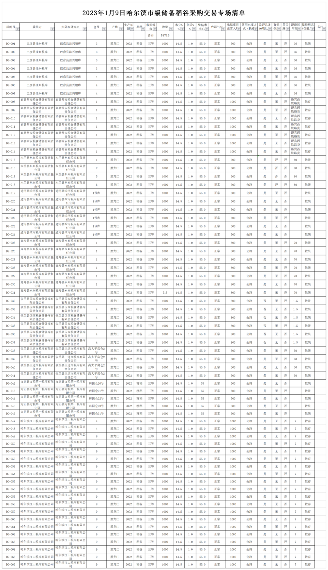 2023年1月9日【10:00】哈尔滨市级储备粮(稻谷)竞价采购交易清单