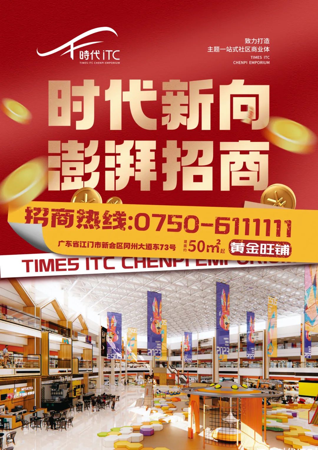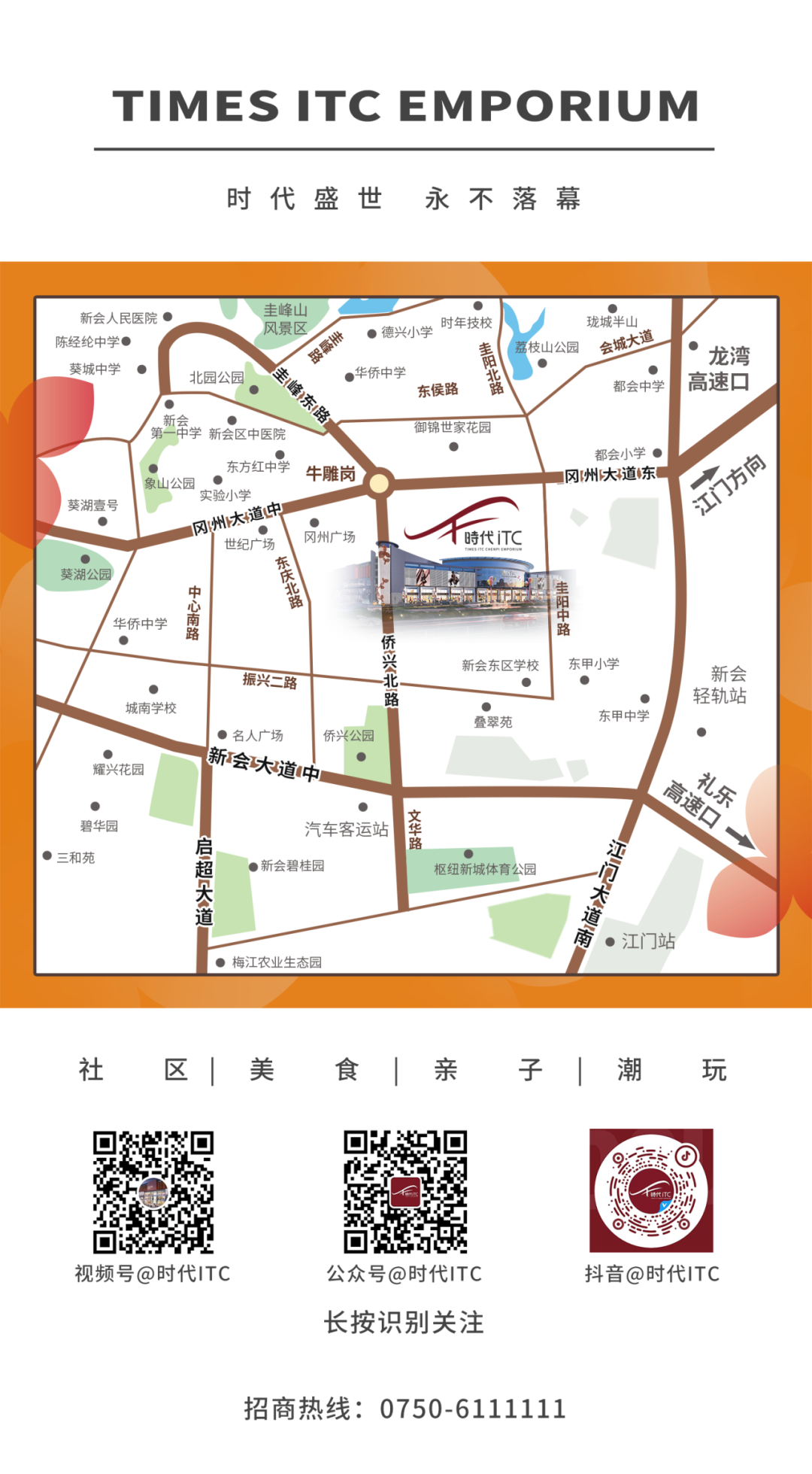 时代盛世,永不落幕。时代ITC雄踞新会区核心商圈旺角,总建筑面积7.3万㎡,在新形势下,科学规划业态占比,首创主题一站式社区商业体。
