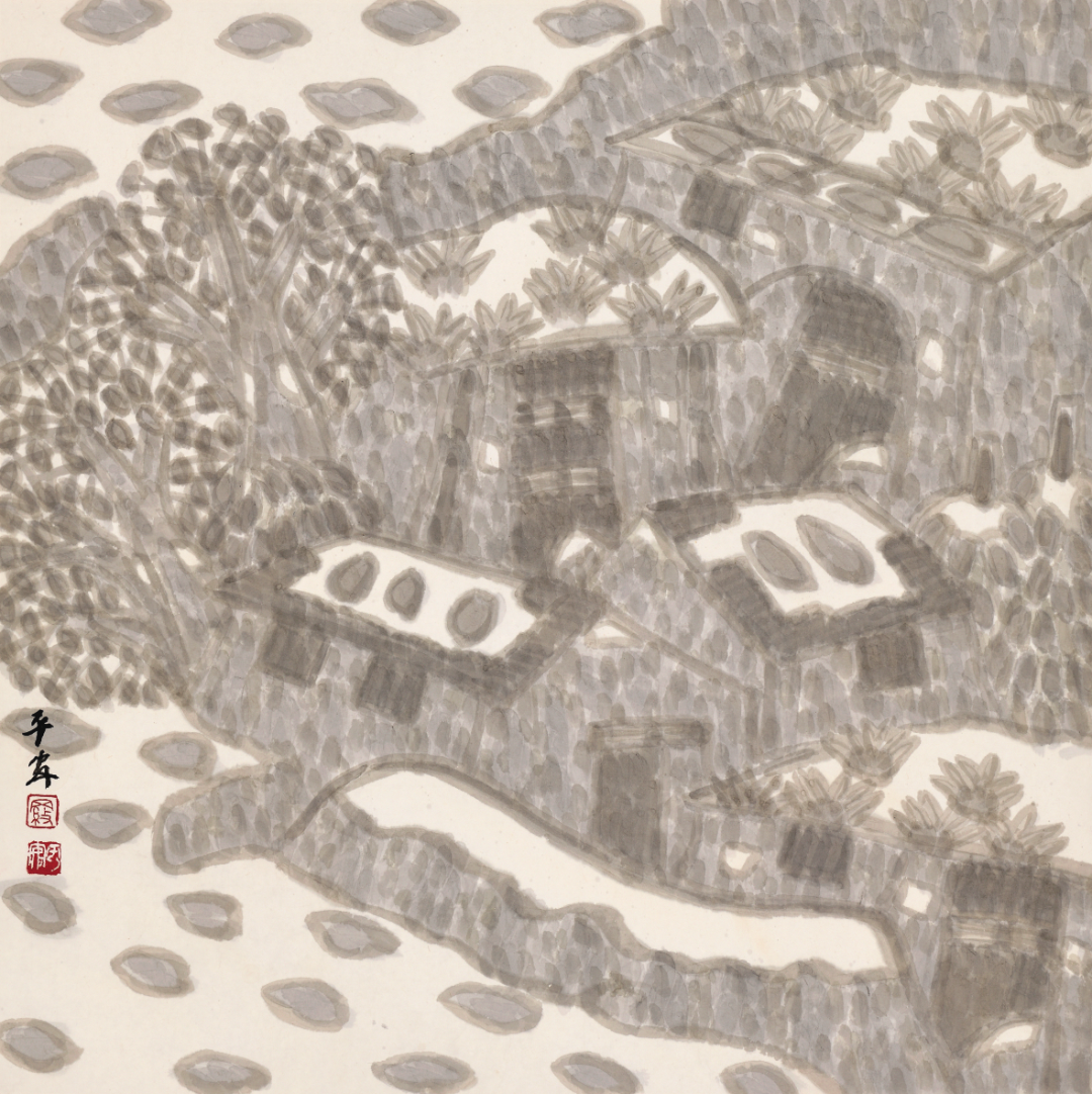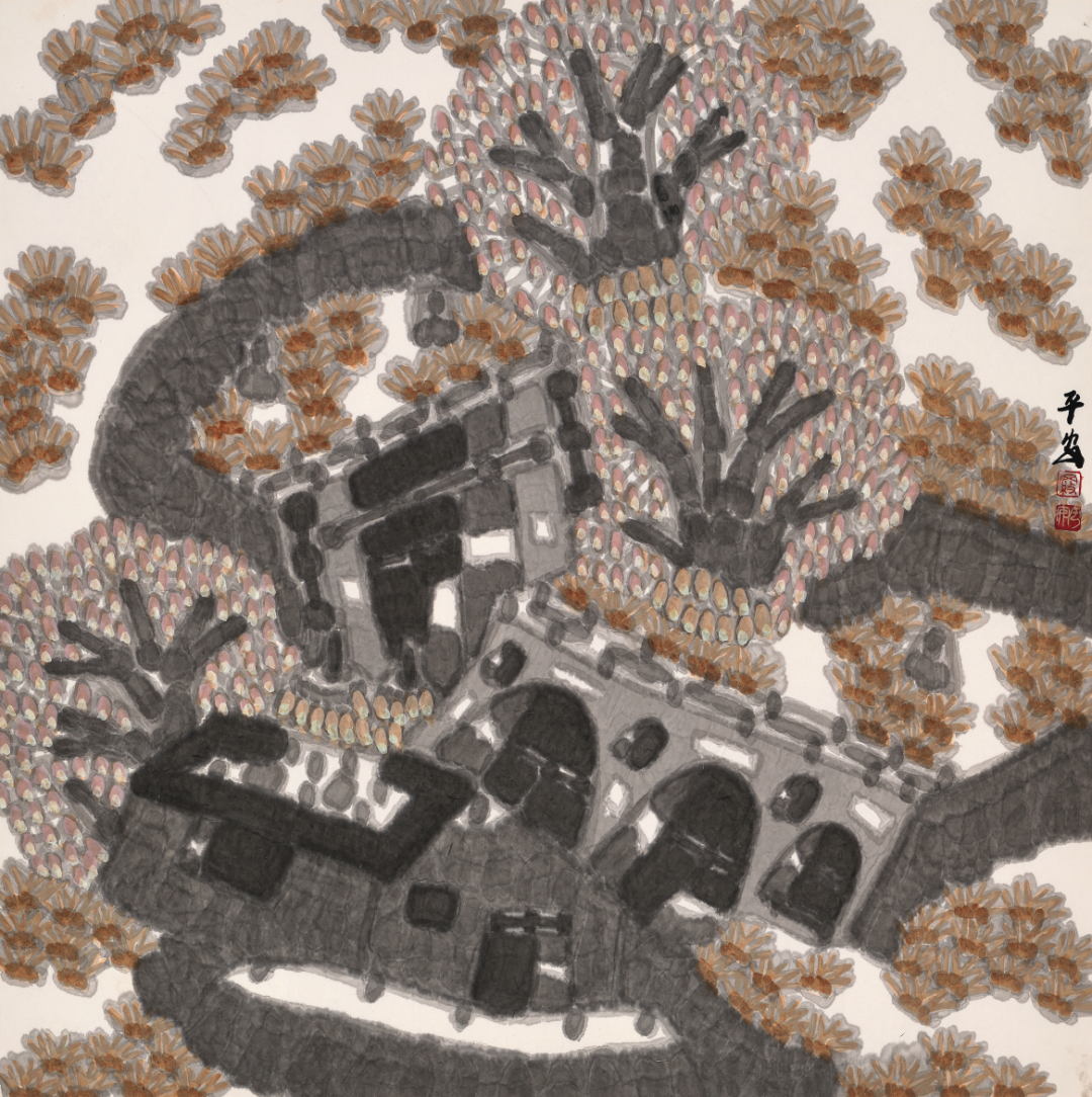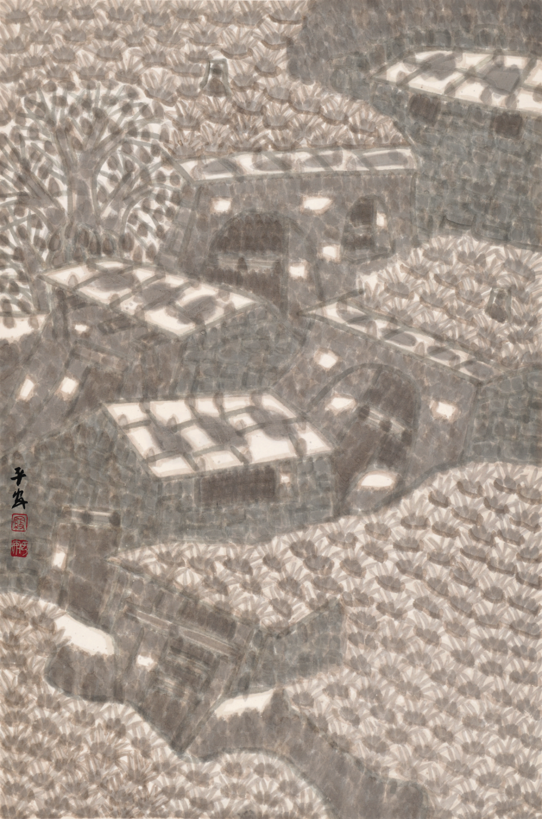 罗平安作品这种超越伟大感情的理性表征,具有逻辑性、秩序性、甚至有算法。将大自然幻化为符号用笔墨重叠堆积、排列,如水晶般美丽朵花,如玉石般温润鸿爪,如金刚般珍珠墨点,如圃田般种菜栽瓜,给人一个安静的世界、一个干净清透无杂陈的空间。这种图式的平面性和错位叠加与法国新印象派修拉点彩及库淑兰彩贴剪纸布局异曲同工,效果或斑斓纷呈,或寂寥安逸。作品均具崇高架构和精神嵌入,线不属遒劲却稳重沉着固不可动,画地为牢画丘围貉,在固执、执念、念意、意欲中获得心性自由。这种自由体现在我为大,大为天,天通理,理通情,搬万物为我所用,万物皆在我心。罗平安在他圈的这块天地里舒坦地释放自我,在这个小小的区域甚至一条狭窄的边缘线和错露空间里有他内心世界的大天地。这块精神栖息地将他的本真和心性隐藏得很深很偏僻很难被发现,所有的激情和浪漫化为春雨垂落在沉厚的土地上,而他享受着这种雨露的敲击和渗化。
