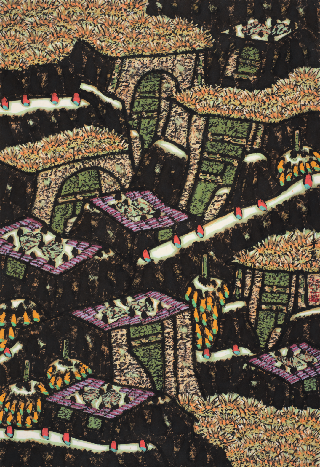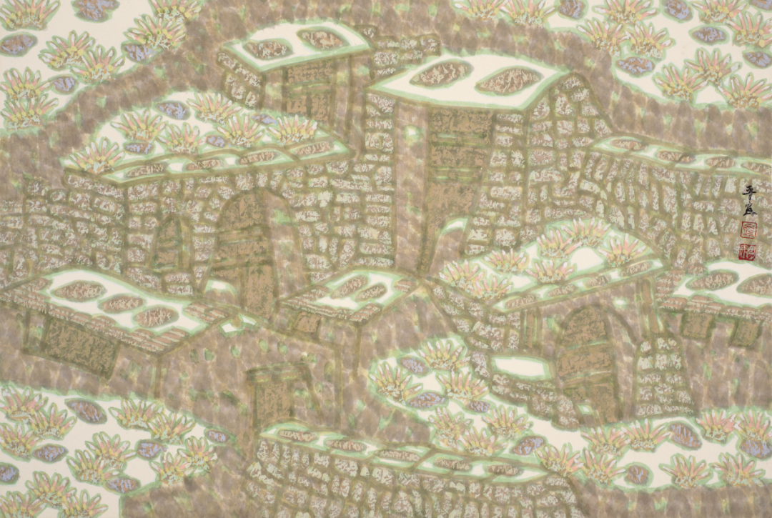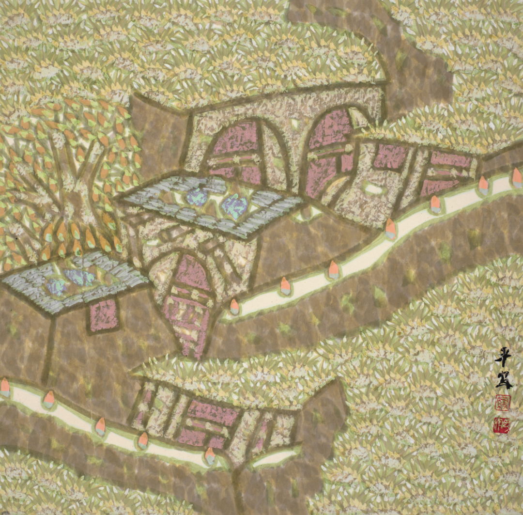 罗平安作品这种超越伟大感情的理性表征,具有逻辑性、秩序性、甚至有算法。将大自然幻化为符号用笔墨重叠堆积、排列,如水晶般美丽朵花,如玉石般温润鸿爪,如金刚般珍珠墨点,如圃田般种菜栽瓜,给人一个安静的世界、一个干净清透无杂陈的空间。这种图式的平面性和错位叠加与法国新印象派修拉点彩及库淑兰彩贴剪纸布局异曲同工,效果或斑斓纷呈,或寂寥安逸。作品均具崇高架构和精神嵌入,线不属遒劲却稳重沉着固不可动,画地为牢画丘围貉,在固执、执念、念意、意欲中获得心性自由。这种自由体现在我为大,大为天,天通理,理通情,搬万物为我所用,万物皆在我心。罗平安在他圈的这块天地里舒坦地释放自我,在这个小小的区域甚至一条狭窄的边缘线和错露空间里有他内心世界的大天地。这块精神栖息地将他的本真和心性隐藏得很深很偏僻很难被发现,所有的激情和浪漫化为春雨垂落在沉厚的土地上,而他享受着这种雨露的敲击和渗化。