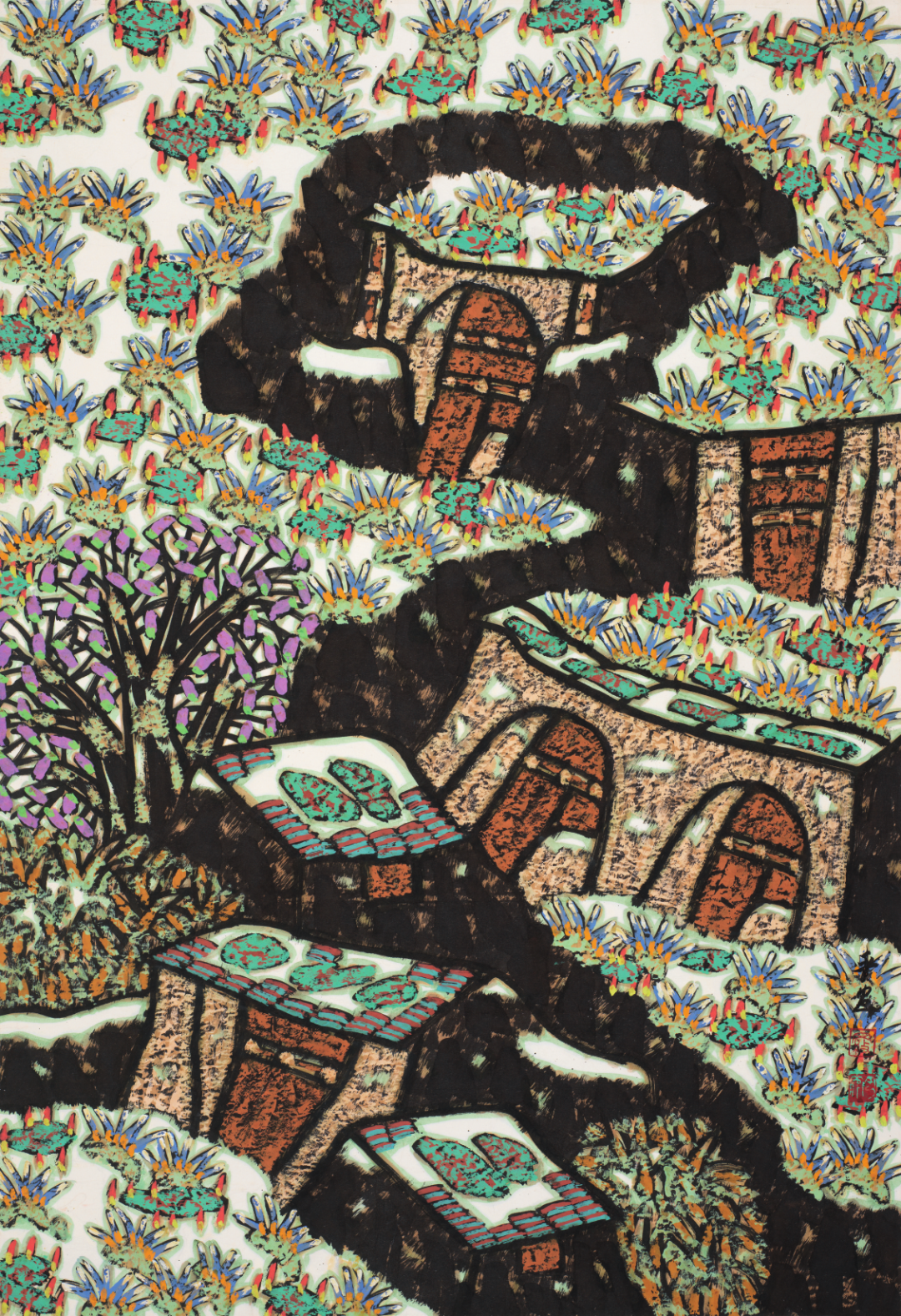 在罗平安的作品中,那盘旋而上、高低起伏的丘陵给我留下了最深的印象。它们或者长满灰黄的、地毯般的荒草,或者裸露着粗糙与干裂延伸到天边。有时候野花点点,披红戴绿,有时候莽莽苍苍,荒蛮而深沉。它们忽断忽连,沟壑纵横。在断层处,时而有几间土屋掩藏着,时而横横斜斜,冒出几棵粗短的老树。天空从没有云朵,太阳偶尔出现,绵延的沙丘上石块夹着土块,像是在不停地流动着,闪着光亮……画面上不曾有过人影,一切都似乎是自生自灭、荒茫辽阔的。如果和榆林照片比较一下便可知,它们有点相像,但又相去千里。来自榆林的感受,只是罗平安的心象,而非实景的摹仿。