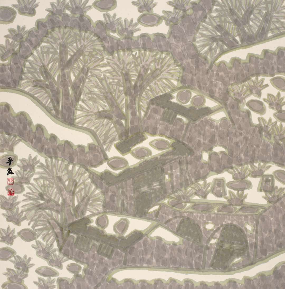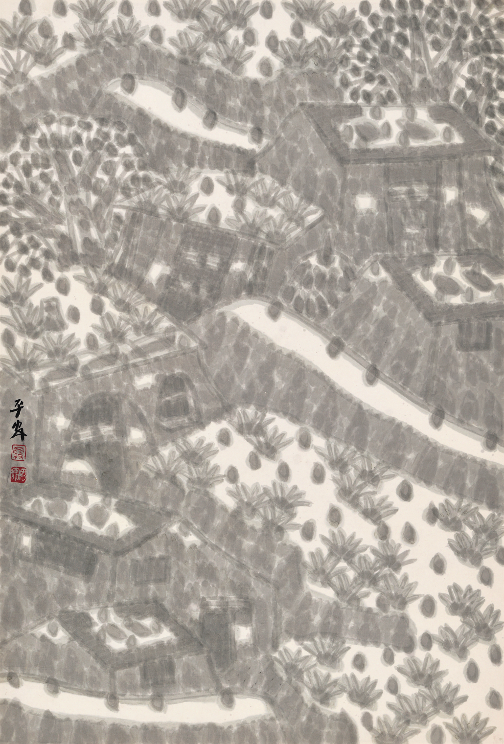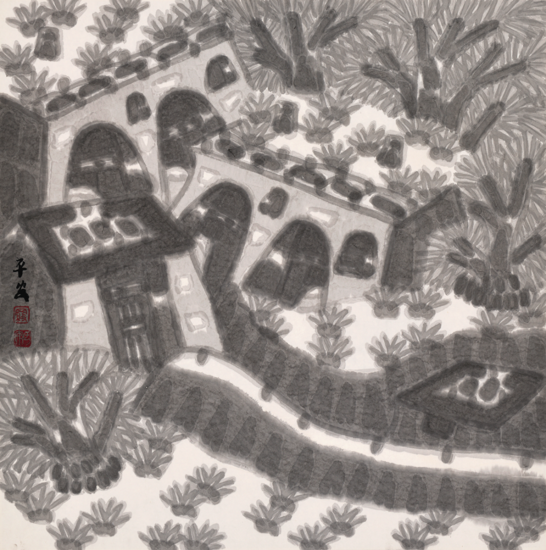 他崇尚自然但反叛避世,他崇尚天人合一但反叛清静无为,他崇尚超凡脱俗但反叛虚无入空。他的艺术是入世的,是对人的生命力的咏歌。与此同步,在形式上他崇尚笔墨为本,但大大强调了色彩的魅力和整体色调;他崇尚传统的章法布局,但大大强调了整块的、平面的现代构成;他崇尚点与线的交响和自由生发,但大大强化了点与线单音阶重复的威力。这三点,构成了他对文人画的重大反叛,构成了作品的单纯性和力度感,在古朴深沉的诗意中闪动着现代节奏。