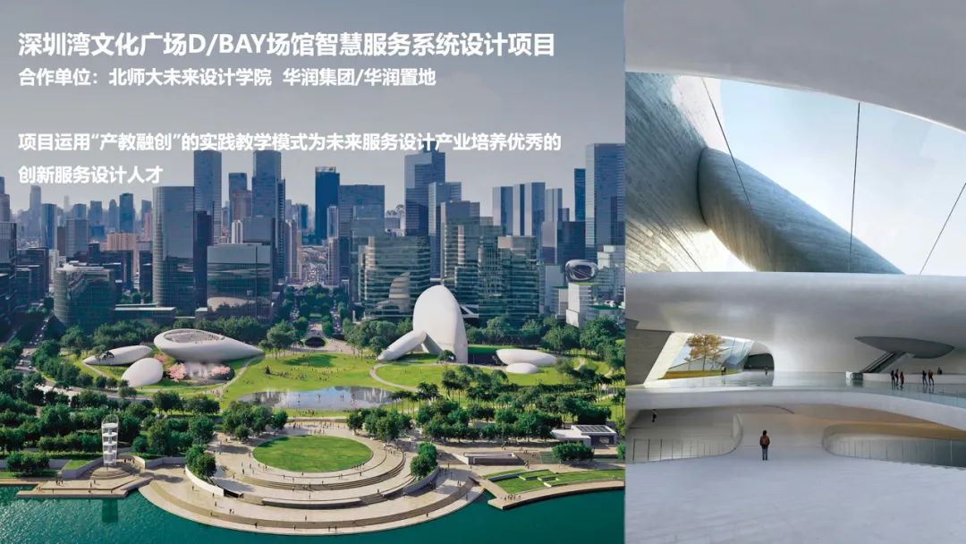 北京师范大学未来设计学院与华润置地合作推出深圳湾文化广场D/BAY场馆智慧服务系统设计项目,运用“产教融创”的实践教学模式为未来服务设计产业培养优秀的创新服务设计人才,服务智慧城市更新。