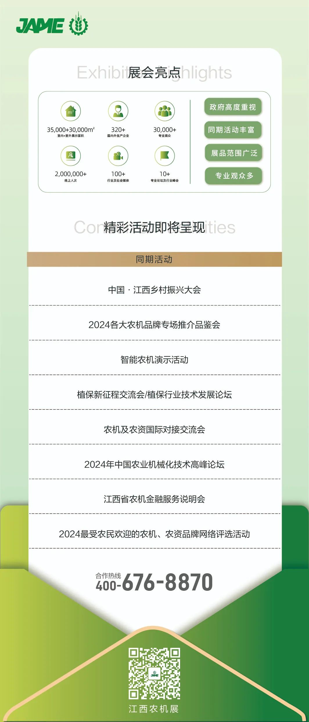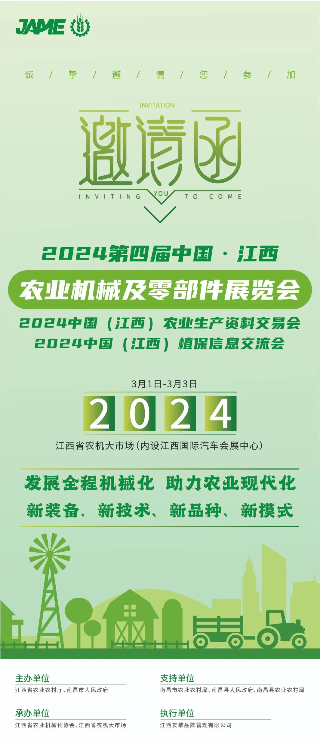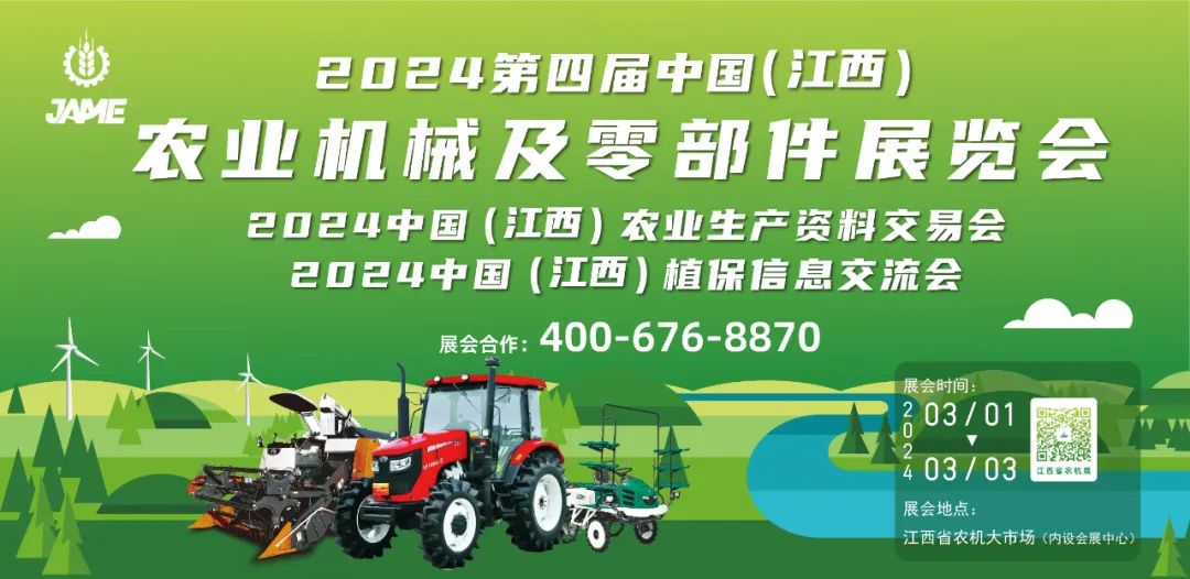 2024第四届江西农机展全新升级,三展联动,2024第四届中国(江西)农业机械及零部件展览会、2024中国(江西)农业生产资料交易会、2024中国(江西)植保信息交流会,将于2024年3月1日至3日联动开启,6.5万展出面积,400余家参展企业,10余场同期活动,专业务实、形式多样,展品丰富、价格实惠、融合发展,农业全产业链优质企业齐聚,共展行业风采。购农机,享优惠,就在江西省农机大市场(内设江西国际汽车会展中心),满怀期待,共赴盛会!